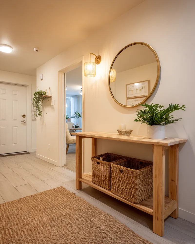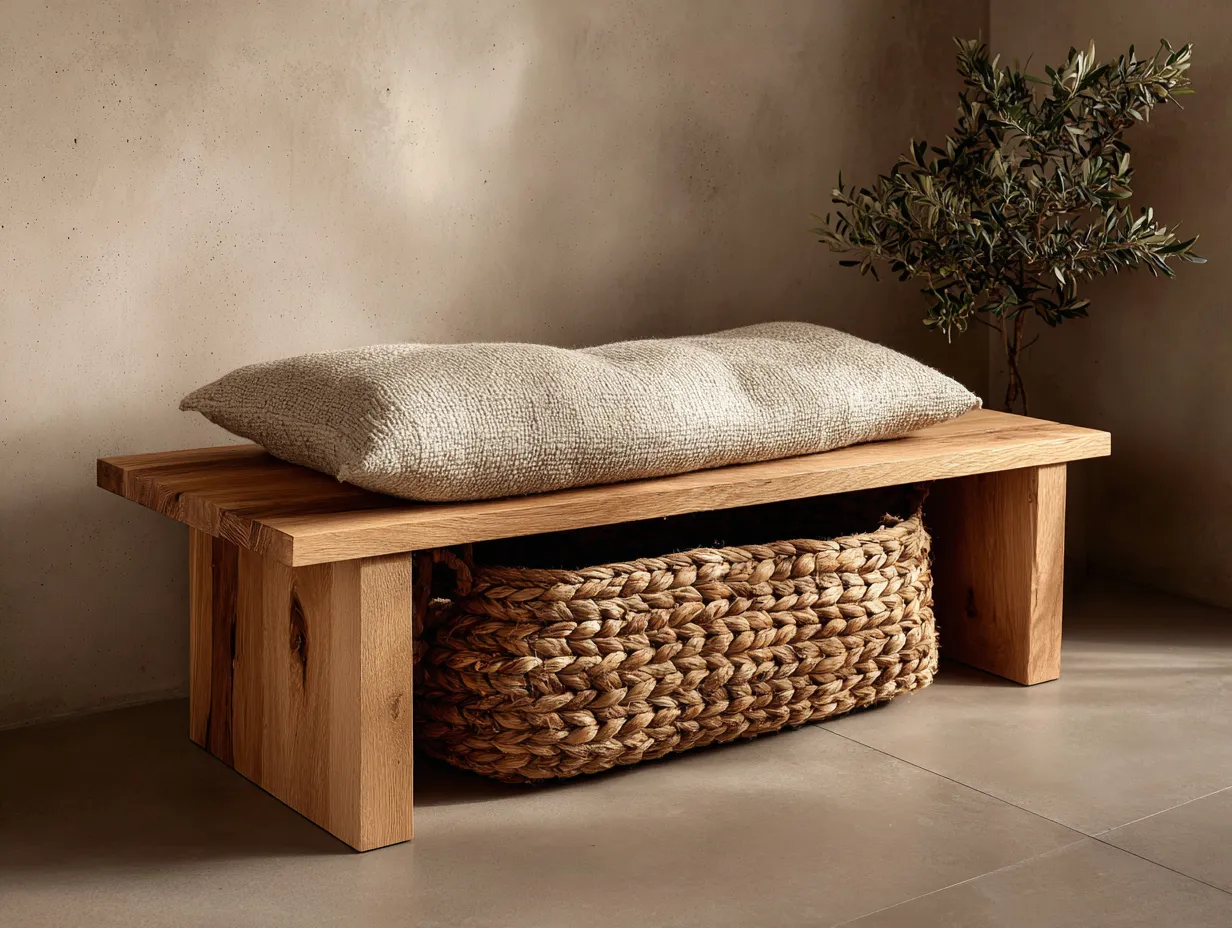 Welcome guests in style. Save for entryway bench ideas! #japandi#japandiinteriors#entrywaybench#hallwaydesign#minimalistfurniture#functionaldecor#naturalwood#homedecor#entrywayideas#designinspiration