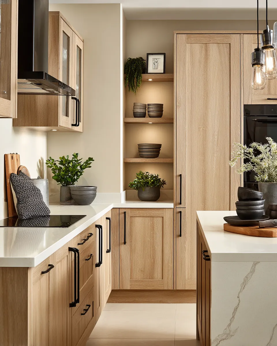 Dreaming of a kitchen that blends Japanese minimalism with Scandinavian coziness? My blueprint involves clean lines, natural materials, and smart storage solutions. Think handleless cabinets in light oak or bamboo, paired with a matte white or stone-look countertop. Add touches of black for subtle contrast – maybe in the cabinet hardware or lighting fixtures. Keep clutter at bay by utilizing open shelving for curated display items, like artisanal ceramics. 🪴 This design prioritizes peace and functionality, making cooking a joy. A kitchen that truly feels like home.
