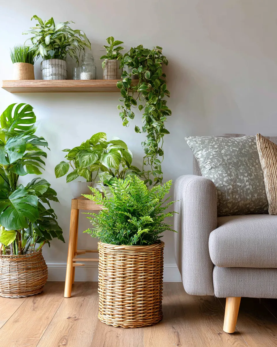 Dreaming of a lush, calming oasis? Bringing the outdoors in is my passion! 🌿 For a living room that breathes tranquility, focus on layered greenery and natural textures. Think trailing Pothos from shelves, a statement Monstera in a woven pot, and delicate ferns on side tables.