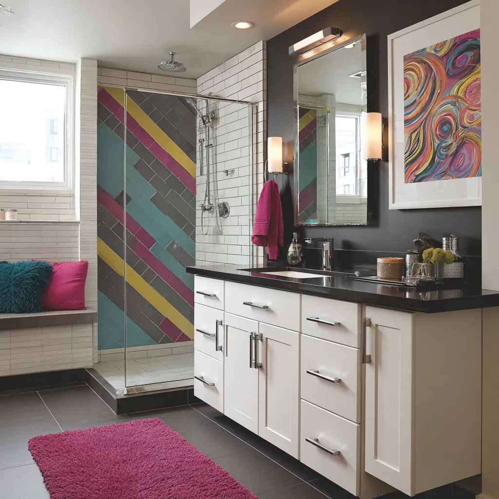 Ready to inject some electrifying energy into your bathroom with 80s-inspired bold graphics and vibrant color blocking? This is about fun, flair, and making a statement! 🎶