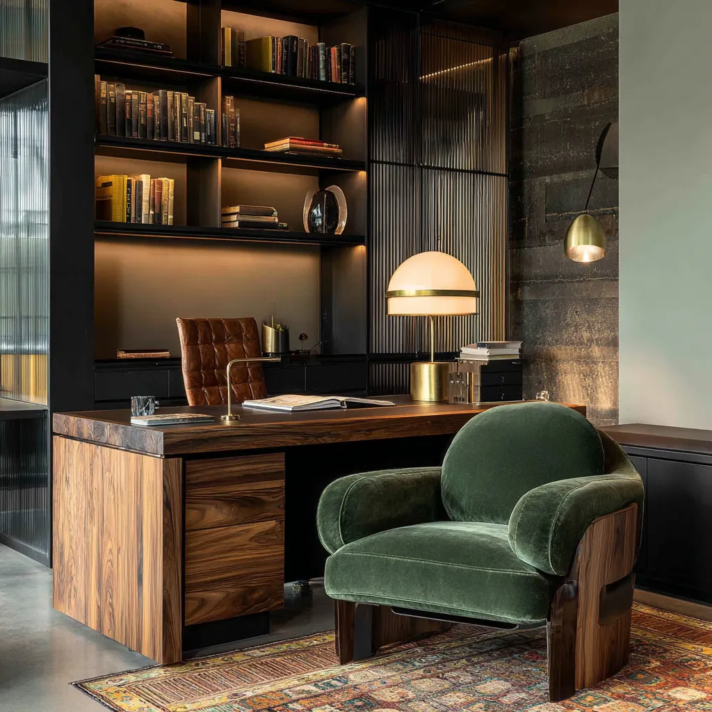Elevate your study with the plush sophistication and tactile richness of the 70s! Think velvet, warm wood tones, and thoughtful layers that create an inspiring and comfortable workspace. 🎶