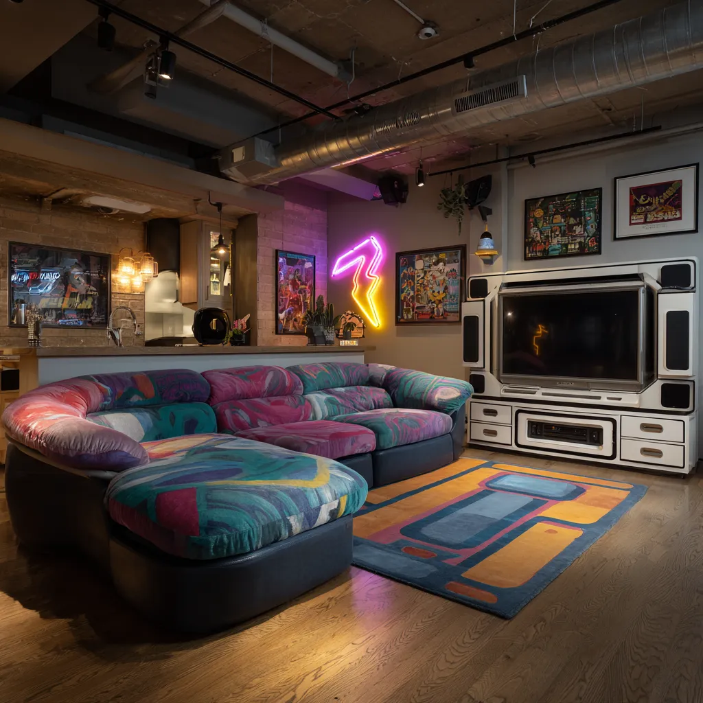 Design an entertainment lounge that screams 80s fun! We're talking bold colors, graphic prints, and all the comfort you need for movie nights and jamming sessions. 🎶
