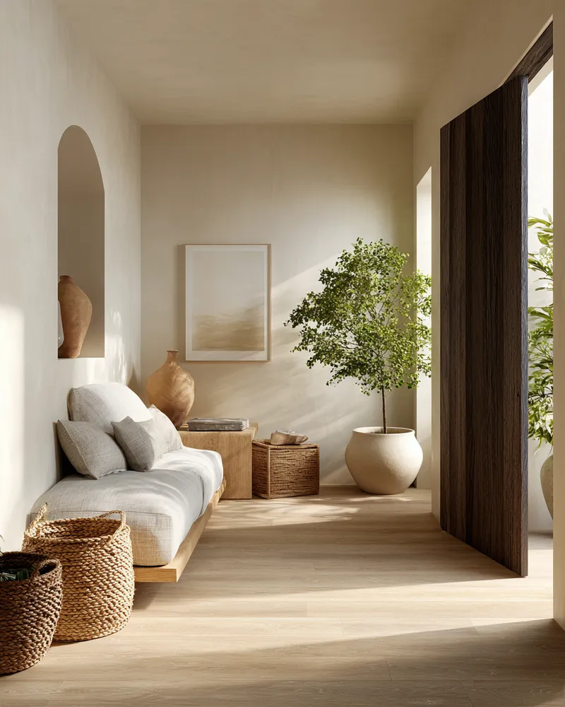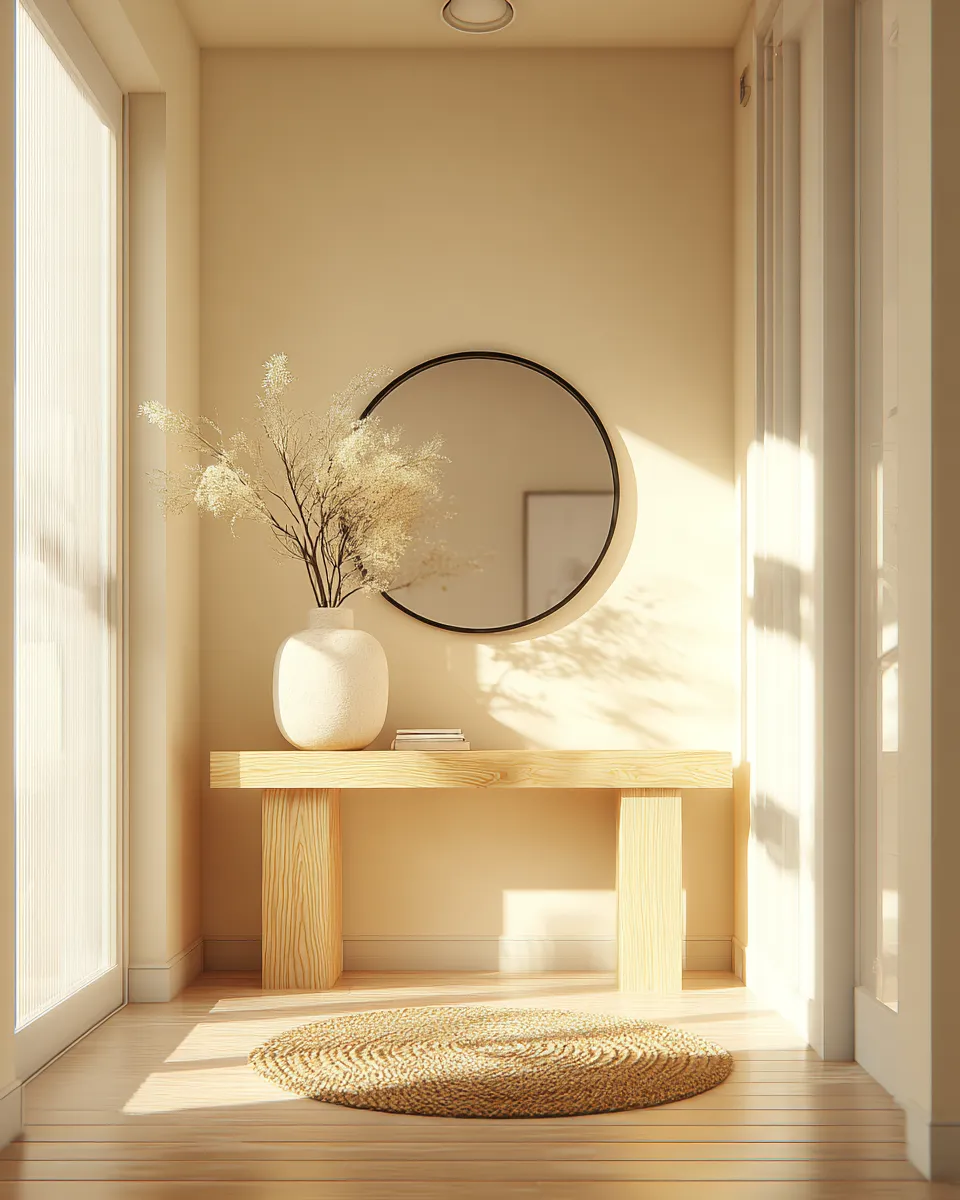 Create an unforgettable first impression with a Japandi-inspired entrance that harmonizes textures and natural materials. Picture a console table crafted from light, natural wood with visible grain, adorned with a textured ceramic vase and a simple, round mirror. 🎍 Add a woven mat at the door to complete the grounded, organic feel. This entryway sets a tone of calm and serenity from the moment you arrive. It's about subtle beauty and mindful design. Save this for your entryway inspo! #japandi#entrywaydesign#naturalmaterials#textureinspo#interiordesign#homedecor#minimalistentryway#designinspiration#decorideas#harmonioushome