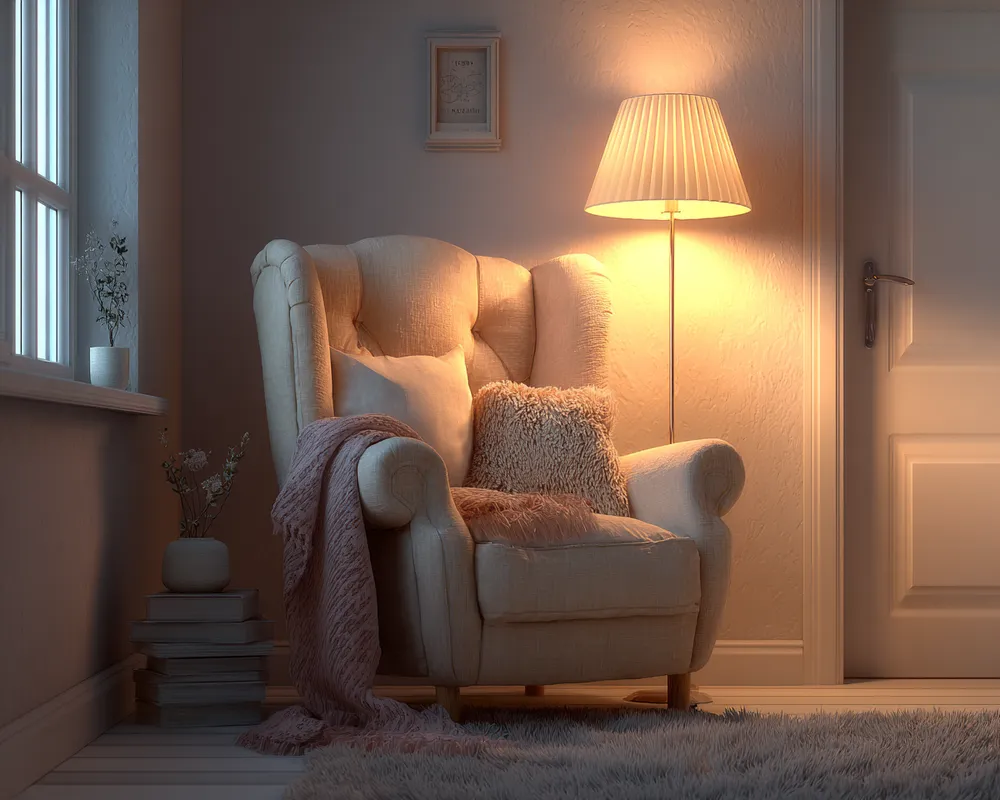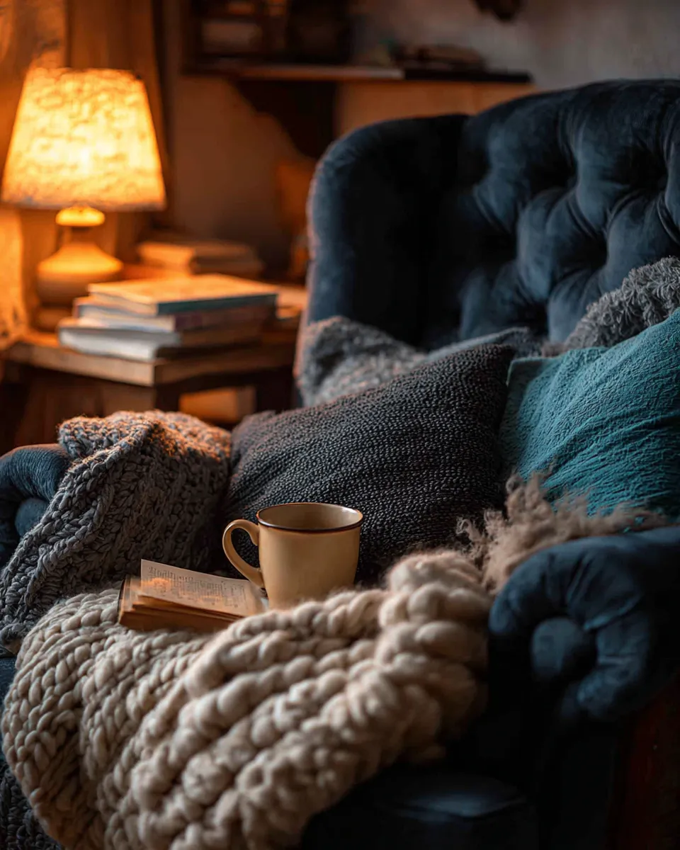 Start with a comfortable armchair โ perhaps in a deep navy or a rich indigo velvet. Layer on plush throws and textured cushions in varying shades of blue, grey, and cream. A soft, ambient lamp with a warm bulb is essential for those long reading sessions.