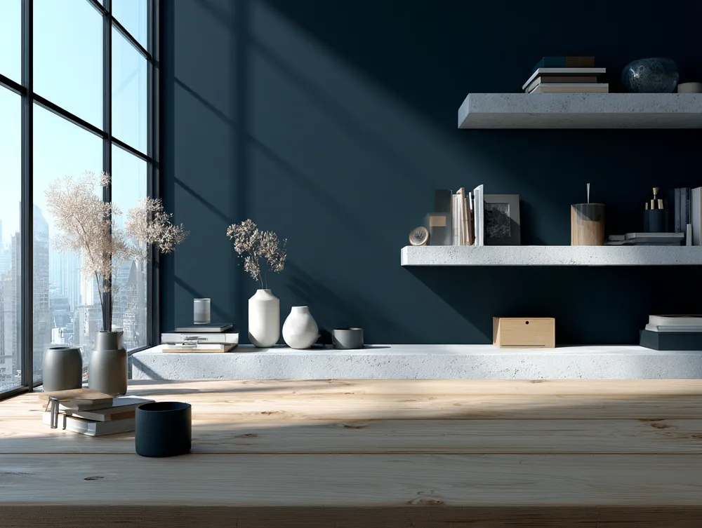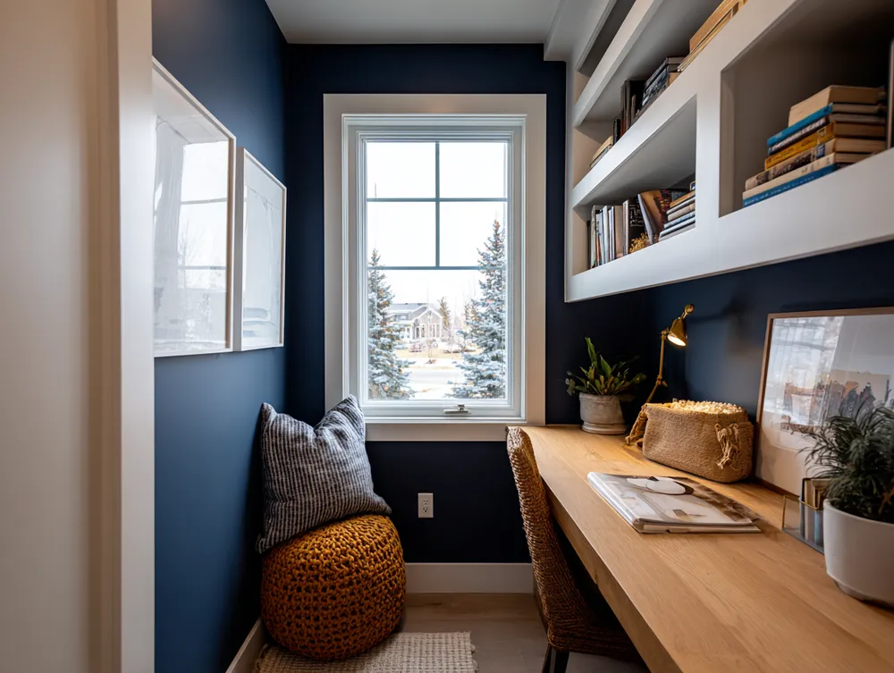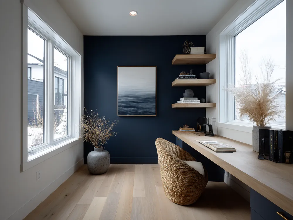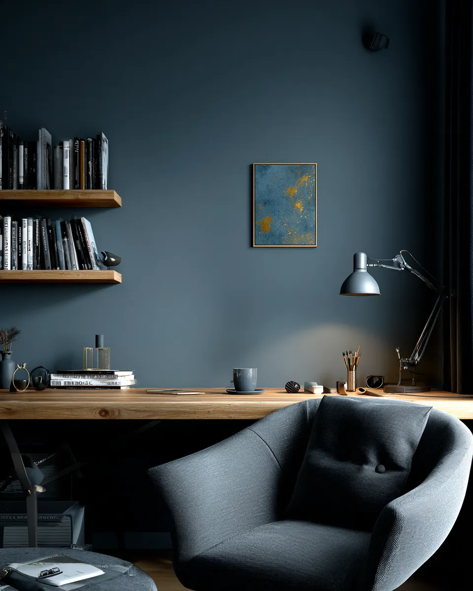 Deep indigo walls or a significant accent piece can create a sophisticated, calming backdrop for your study. Complement this with natural wood furniture, clean lines, and soft, functional lighting. Incorporate subtle personal touches and organized storage.
