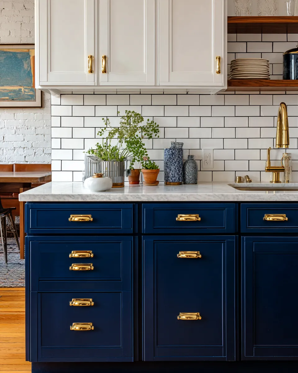 Consider painting your base cabinets a deep, rich indigo while keeping your upper cabinets white or a light neutral. This grounds the space and draws the eye downwards, creating a sense of more vertical height. Pair with natural wood or brushed brass hardware for a warm contrast.