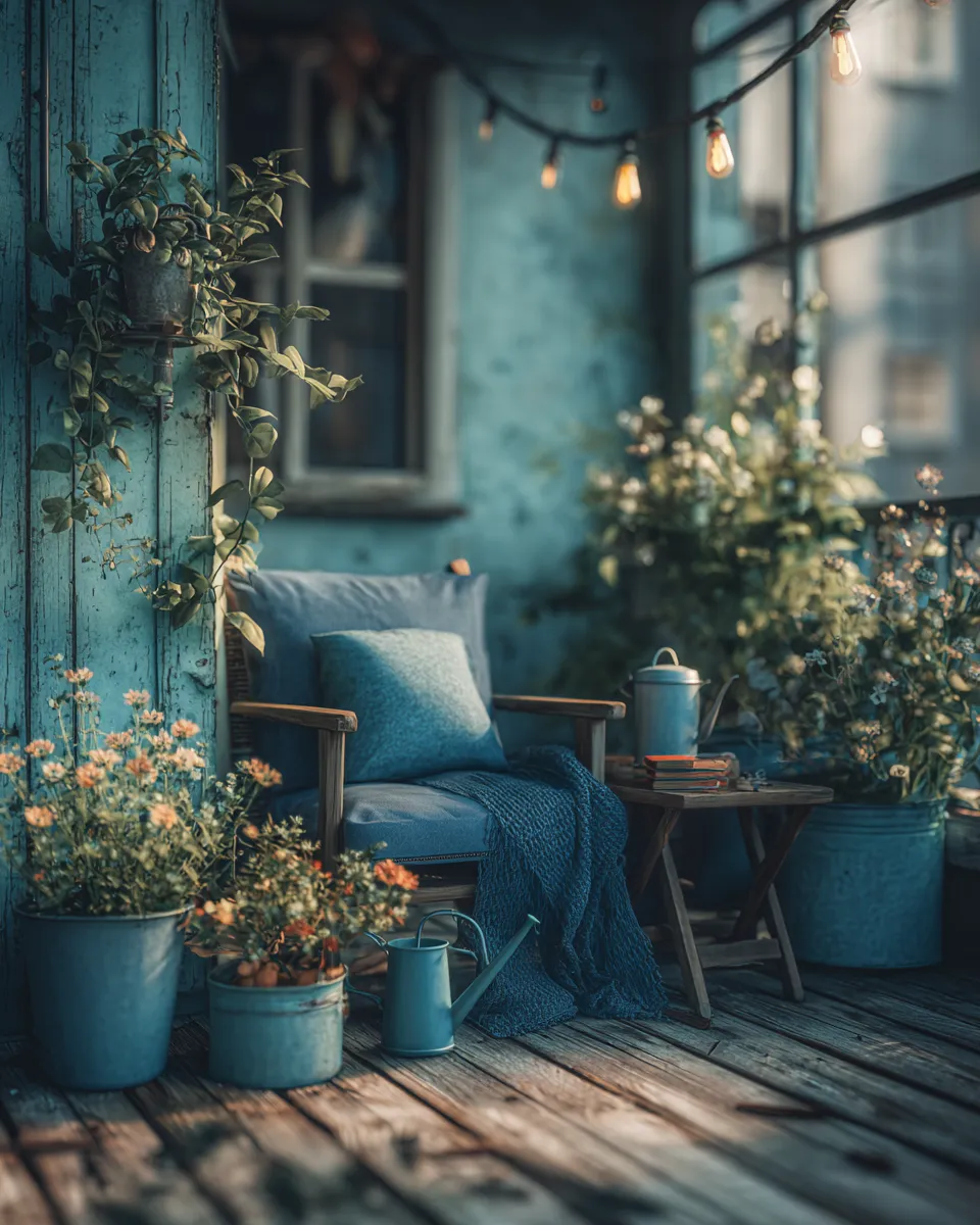Think of indigo planters for your herbs and flowers, a navy blue outdoor rug to define the space, or cushions in deep blue hues for your seating. Incorporate natural wood finishes for warmth, and perhaps string lights for evening ambiance.
