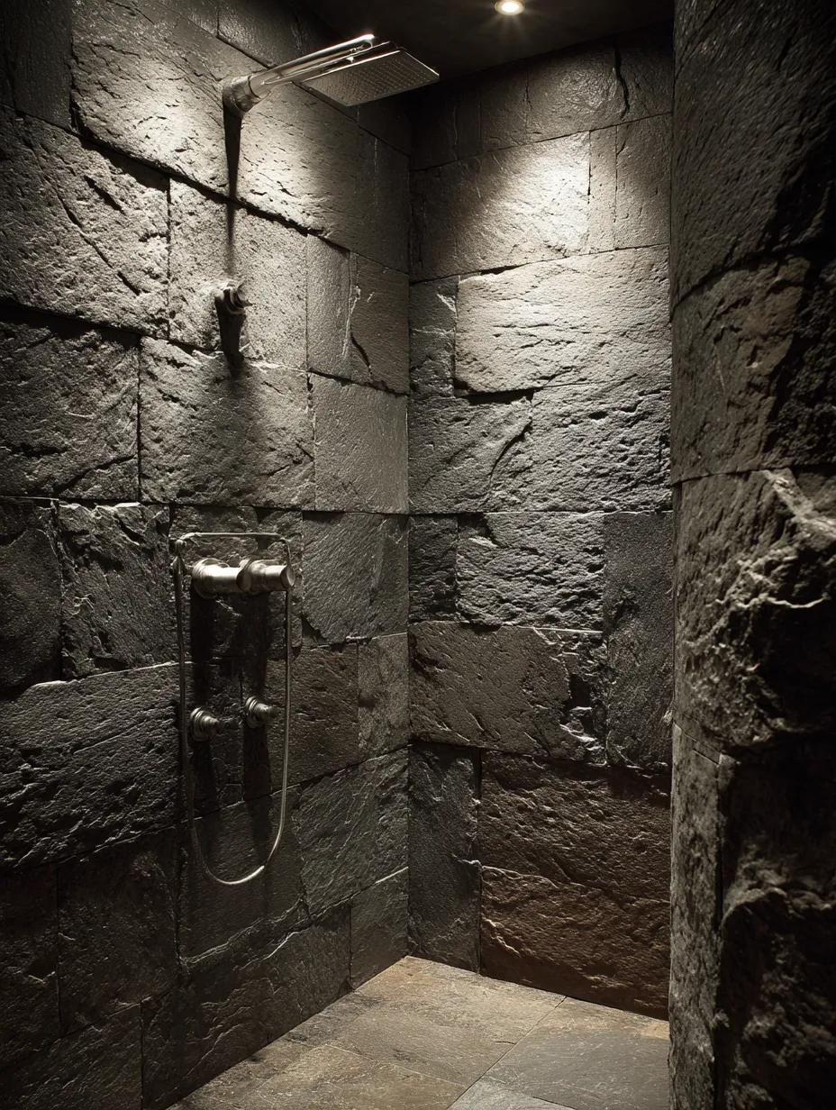 Ready to make a bold statement in your bathroom? Slate is your material! 🌑 This naturally occurring metamorphic rock offers incredible depth, rich dark tones, and a wonderfully rugged texture that adds drama and sophistication.