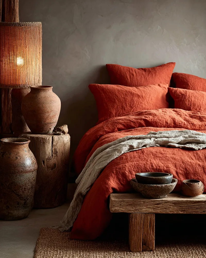 Save for your cozy bedroom accent ideas! 💡 #terracottaideas#bedroomaccents#earthydecor#warminteriors#materialtexture#bohochic#homedecor#organicmaterials#accentwall#decorinspo