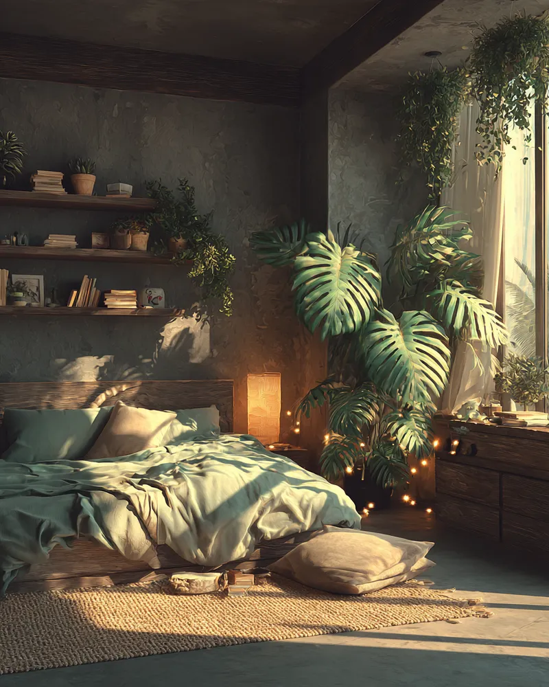 Transform your bedroom into a vibrant, green sanctuary for ultimate relaxation and rejuvenation! 🌿 My aim is to infuse spaces with lushness and calm. Here’s how to create your indoor oasis: • **Foliage Focal Points:** Large potted plants like a ZZ plant or a Calathea can add drama and life. • **Hanging Charm:** Drape ivy or pothos from shelves or ceiling hooks. • **Green Hues:** Incorporate softer shades of green in your bedding, curtains, or rugs. • **Natural Textures:** Use linen, cotton, and wood for a tactile, earthy feel. • **Soft, Ambient Lighting:** Mimic nature's gentle glow with lamps and fairy lights. ✨ Cultivate a space that feels both invigorating and profoundly peaceful. Save this for your dream bedroom makeover! 🤎