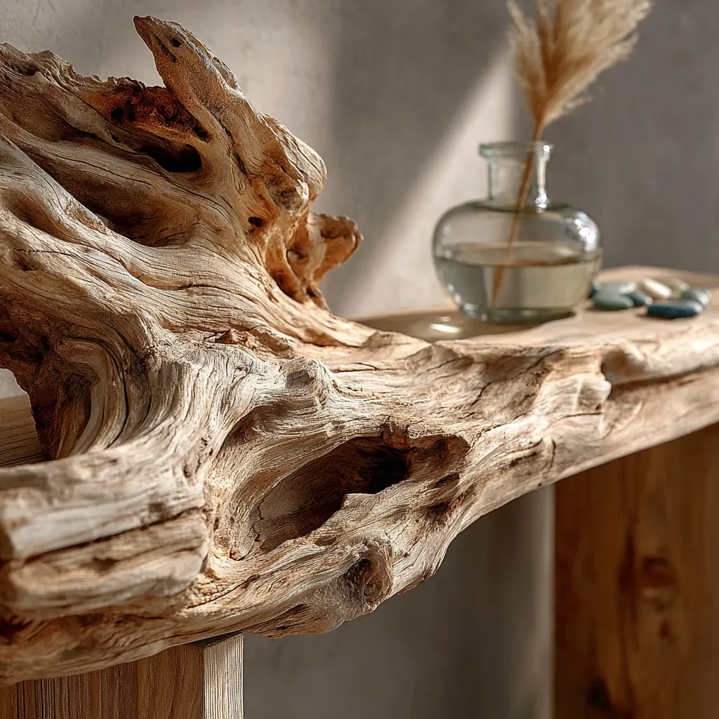 Elevate your coastal interior with the raw beauty of driftwood. These weathered pieces add instant texture, character, and a connection to the sea. A large piece can serve as a stunning sculptural element on a mantelpiece or console table. Smaller pieces can be incorporated into arrangements with shells and sea glass, or used as unique hardware on cabinets. The key is to let the natural form of the driftwood shine, creating a focal point that speaks to the organic beauty of the coast. โจ How do you style natural elements?