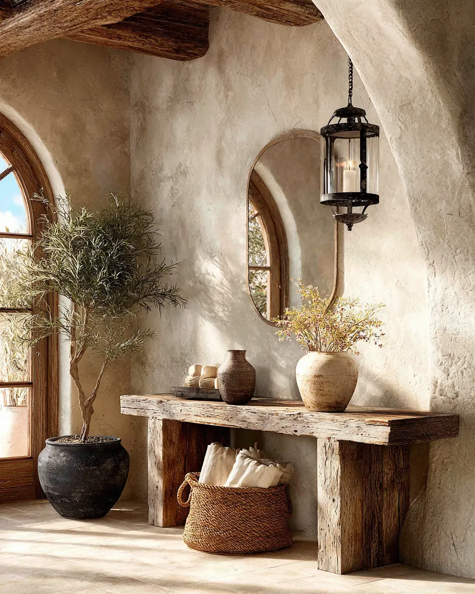* **Farmhouse Console:** A weathered wood table with a rustic feel.