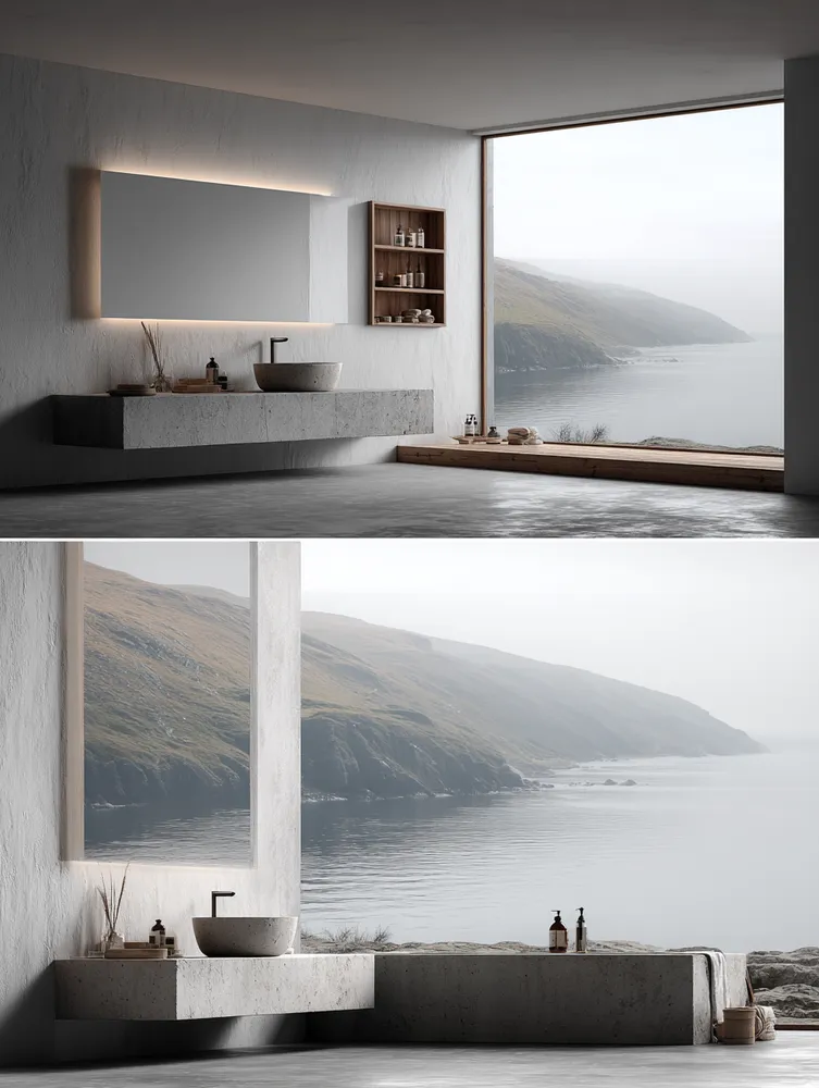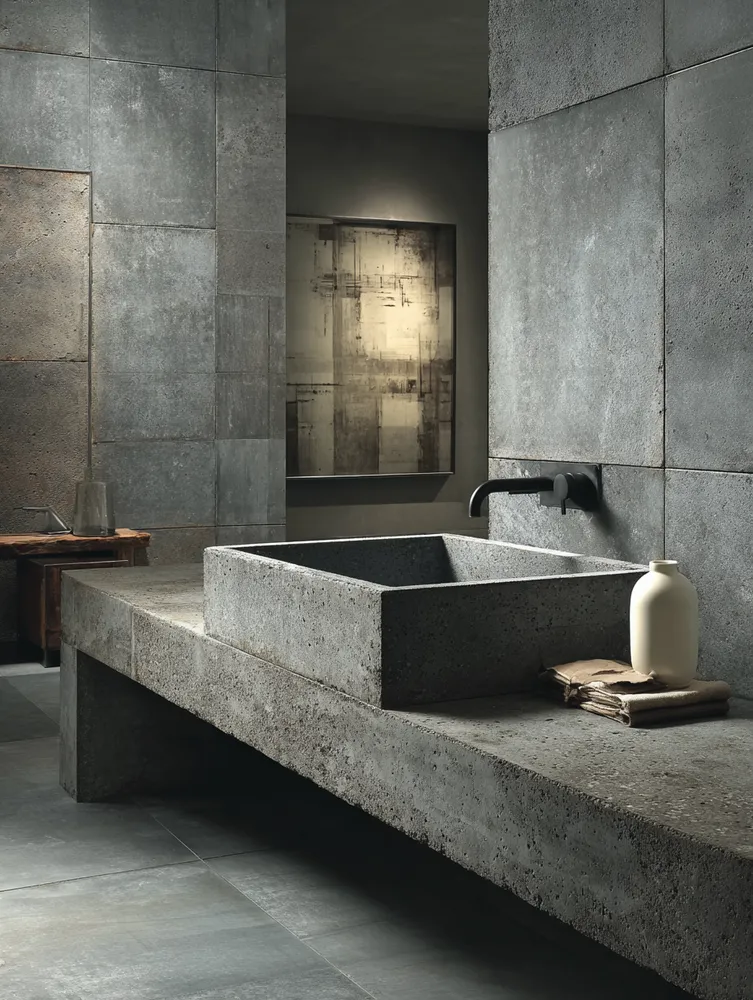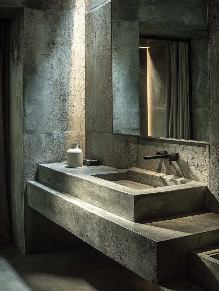 * **Wall Finishes:** Microcement or textured concrete panels can create a dramatic, monolithic effect.