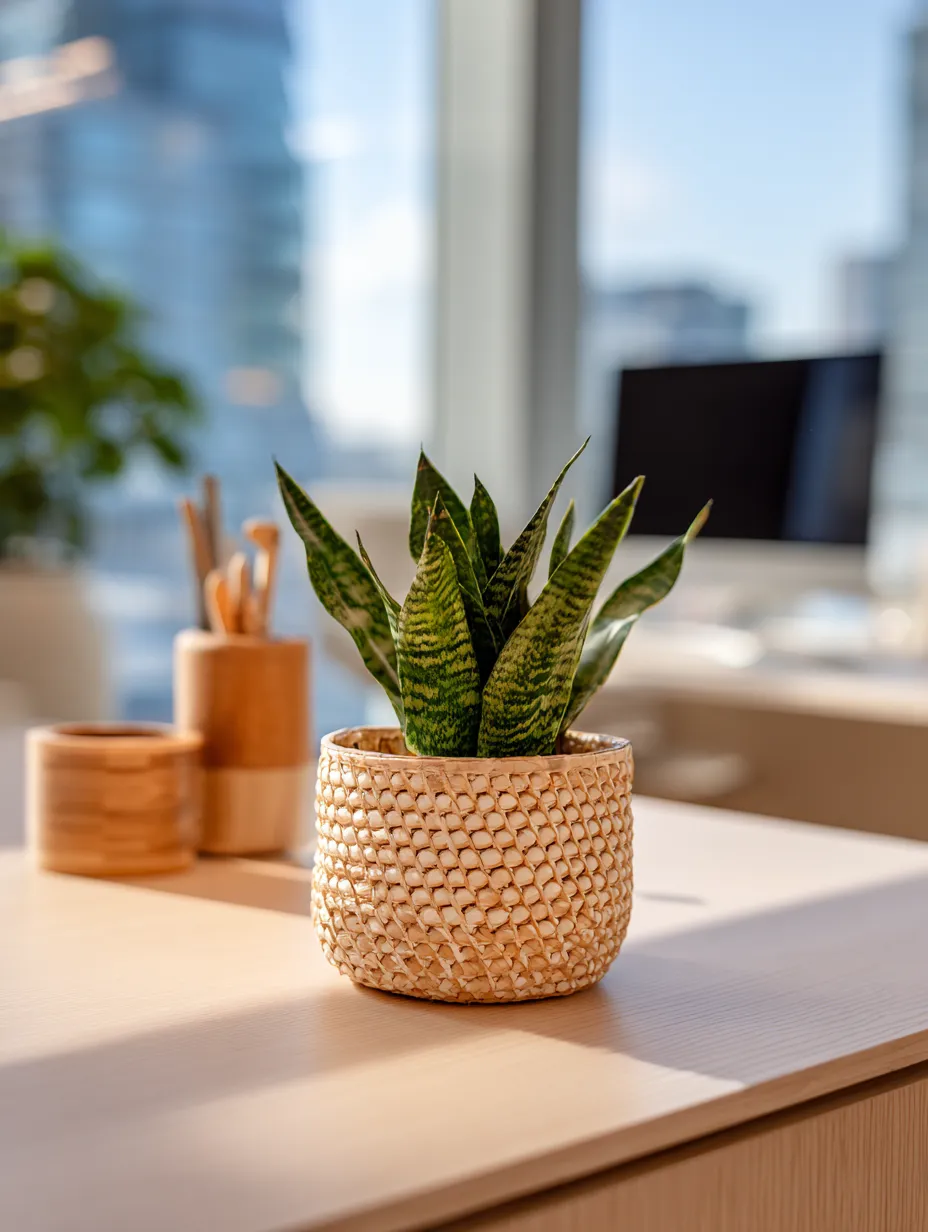 4. **Natural Materials:** Introduce elements like a wooden desk organizer, a woven basket, or a stone coaster.