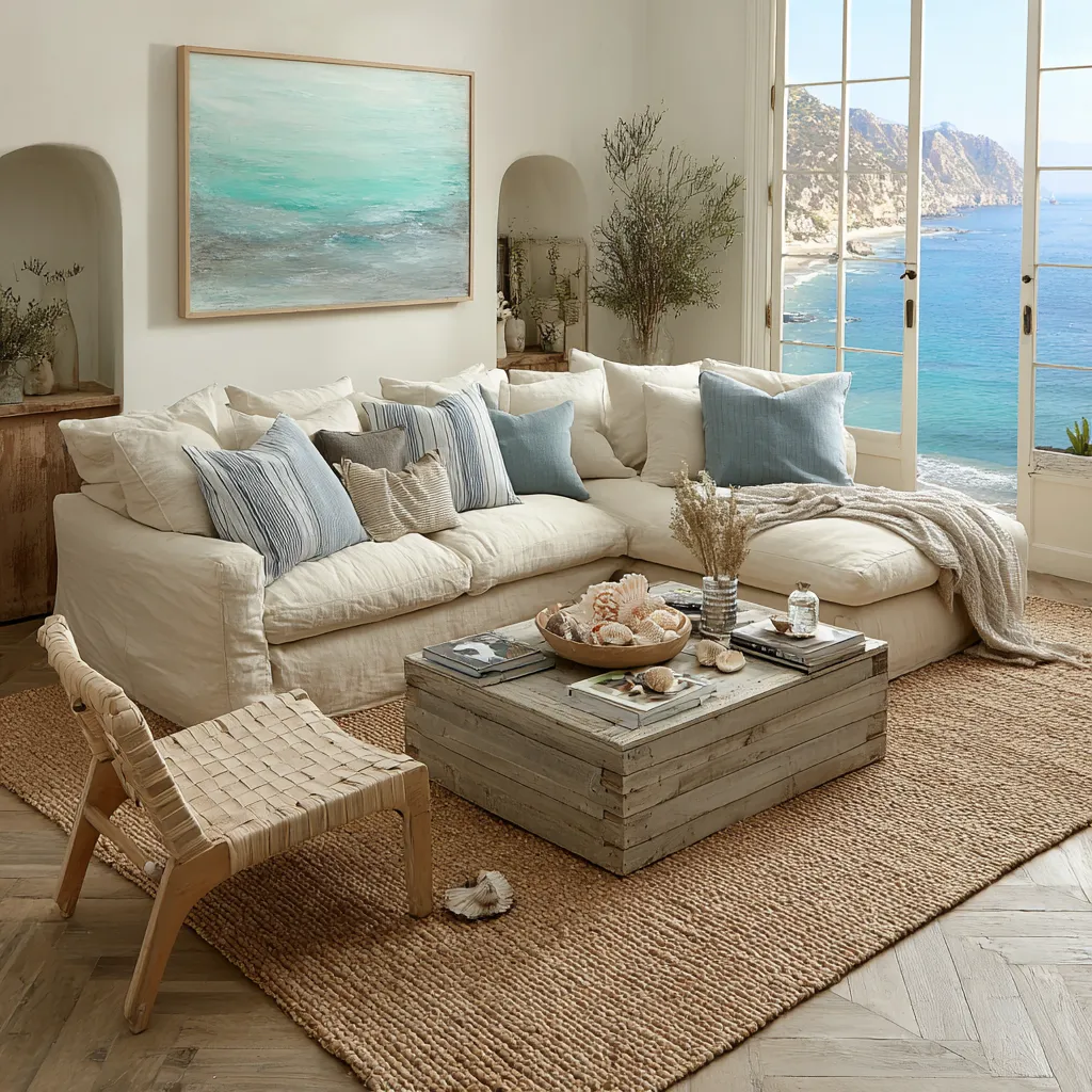 Serene Seaside Living Room: Effortless Coastal Elegance โจ