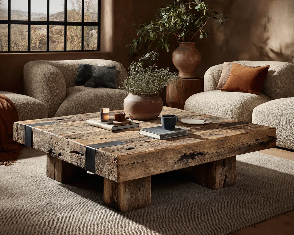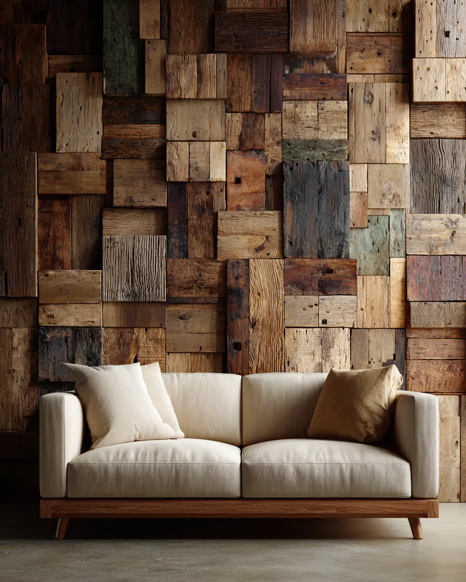 Let these pieces add depth and history to your modern living. Save this for your next feature project! #ReclaimedWoodIdeas#RusticDecorIdeas#WoodAccentWallIdeas#SustainableDesignIdeas#CharacterFilledHome#HomeDecor#InteriorDesign#LivingRoomInspo#FarmhouseStyle#DesignMaterials