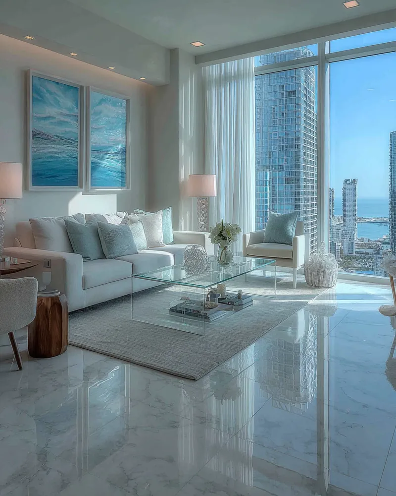🛋️ **Furniture:** Opt for comfortable, inviting pieces with clean lines and perhaps velvet or textured fabrics.