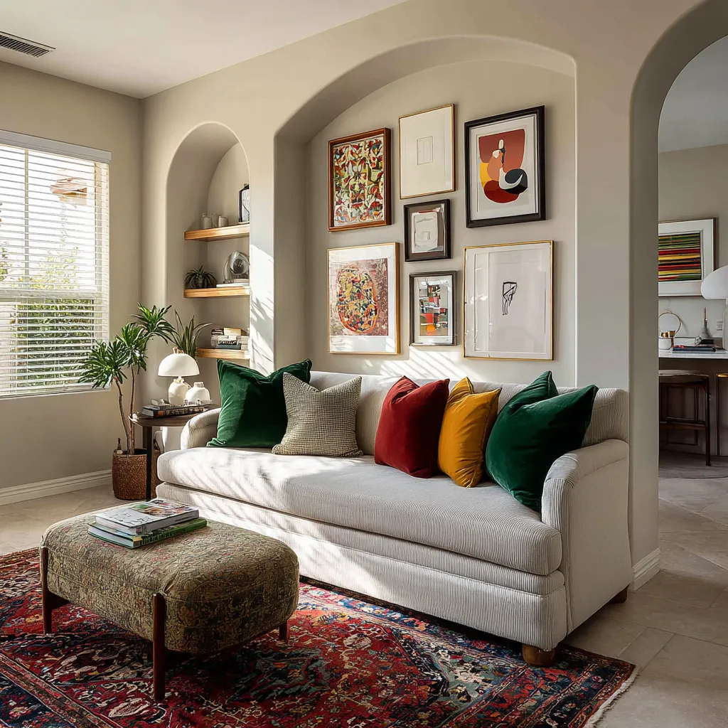 Tired of a beige-dominated space? You don't need a total reno to add serious charm! Let's play with color! 🎨 My secret? Strategic pops! Think a vibrant velvet throw pillow on a neutral sofa, a gallery wall bursting with quirky art, or even a statement rug that ties everything together. 🌈 These elements add personality without overwhelming your calm. Embrace your inner maximalist, even if it's just for a touch! Which pop would you try first? Save this for a happy home makeover! 💖