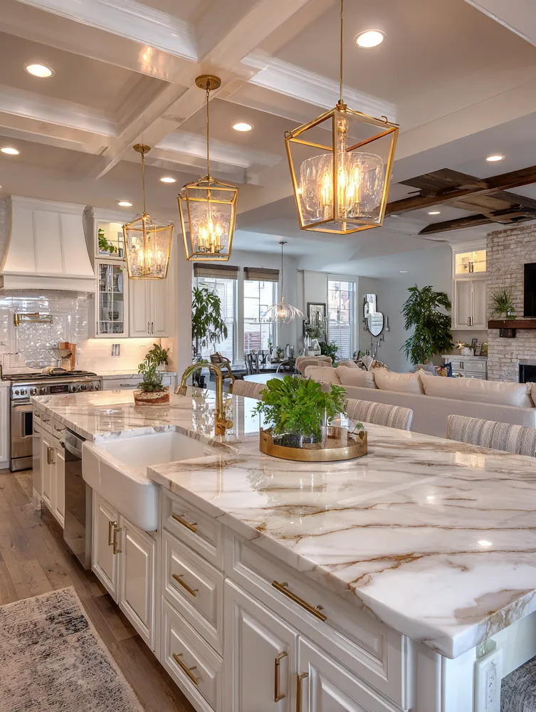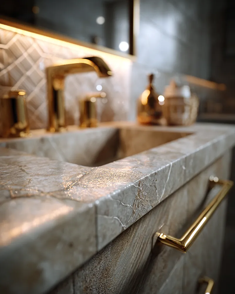 For a warm, inviting, and undeniably sophisticated look, combine marble with brass. ✨ This pairing creates a beautiful balance, with the coolness of marble beautifully offset by the rich, warm tones of brass. Consider brass lighting fixtures above a marble countertop, brass accents on furniture, or even brass inlays. It's a classic combination that brings elegance and character to any room. Embrace this warm sophistication! 💡