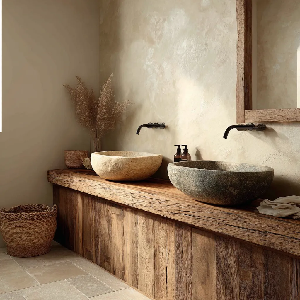 Save this for your natural bathroom oasis! #RegionalBathroomIdeas#ClayPlasterBathroom#TimberBathroomVanity#NaturalMaterialBathroom#SpaBathroomIdeas#HomeDesignIdeas#AuthenticBathrooms#VernacularBathrooms#SereneSpaces#BathroomInspo