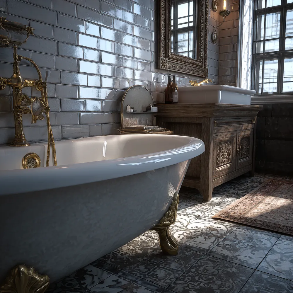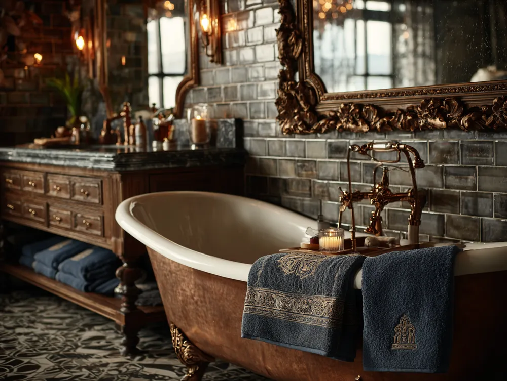Even the bathroom can exude Gilded Age grandeur! The key is to incorporate luxurious materials and ornate details. Consider a clawfoot bathtub as the centerpiece, perhaps with polished brass or gold fixtures. ๐ Look for vanity countertops in marble or granite, paired with intricately detailed cabinetry. Large, ornate mirrors above the sink are a must, as are decorative light sconces. Embellish with plush towels in rich colors and perhaps a small, antique-inspired stool. Save this for your lavish bathroom makeover!