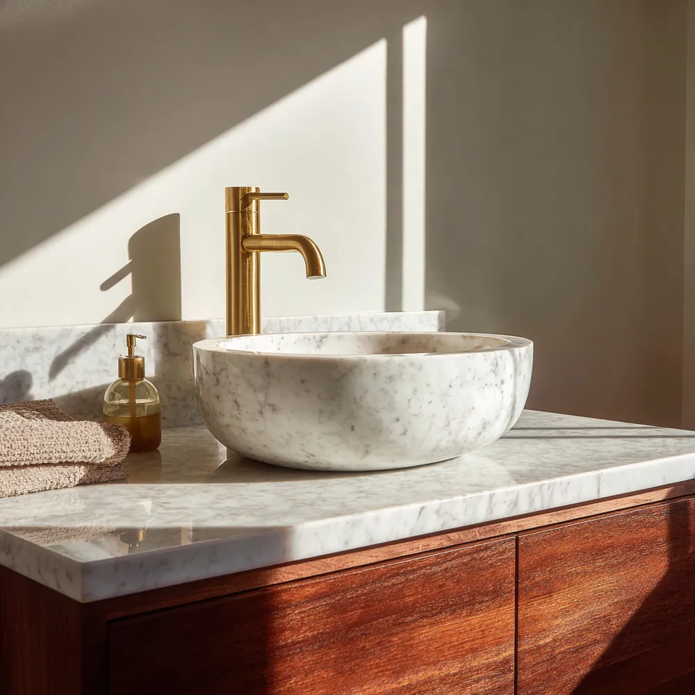 Add a touch of timeless elegance to your bathroom with a luxurious marble sink! ๐ค Whether it's a striking vessel sink atop a vanity or a sleek undermount design, marble brings unparalleled sophistication to your wash area. The natural patterns and cool feel of marble transform your bathroom into a serene, high-end retreat. Itโs a classic choice that never goes out of style, offering enduring beauty and a touch of pure luxury. Save this for your bathroom renovation plans! โ๏ธ