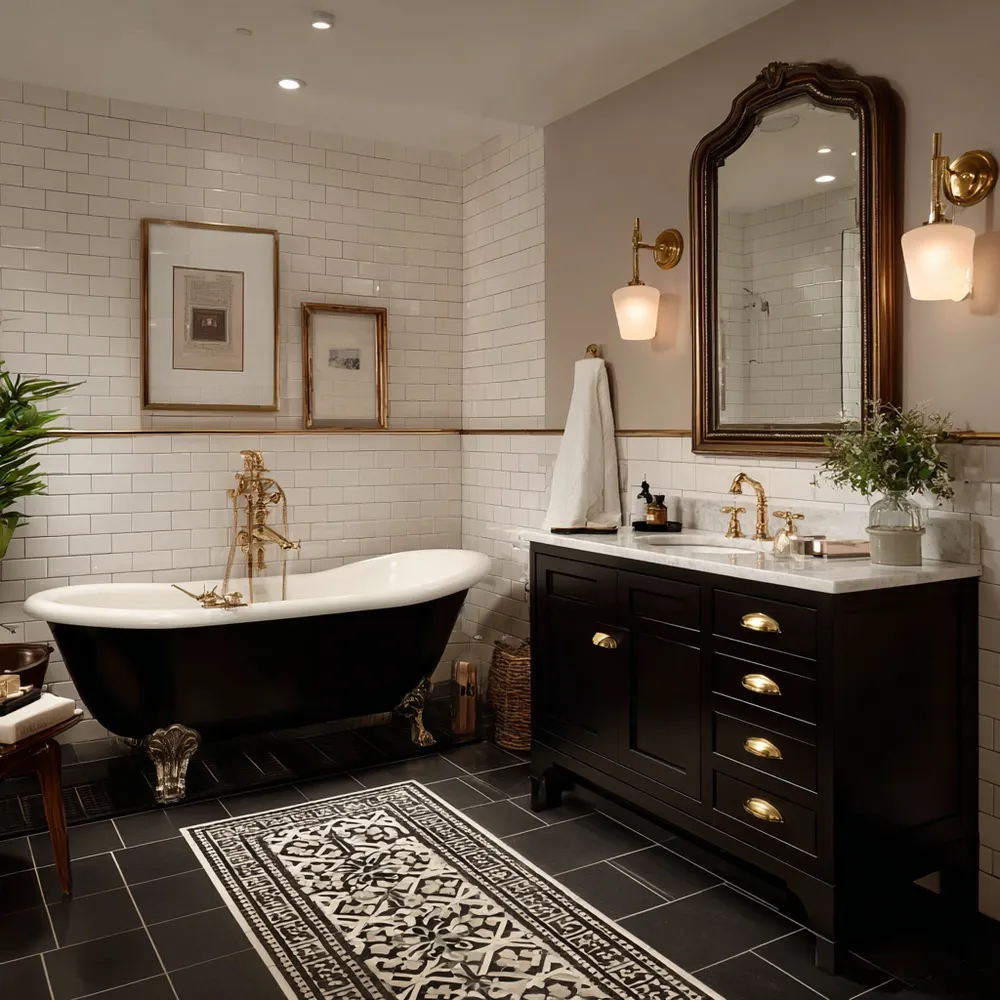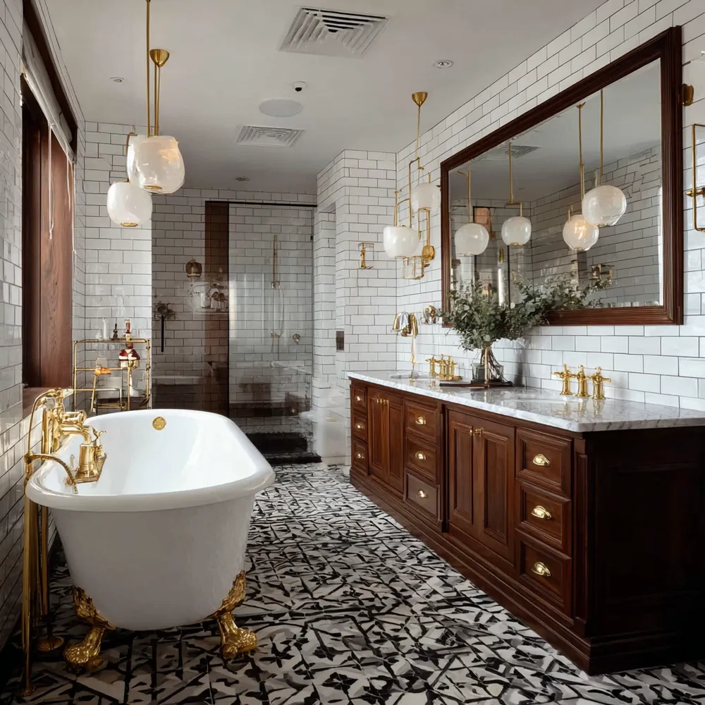 Turn your bathroom into a spa-like Art Deco haven! ๐ Symmetry and luxurious materials are key. Imagine sleek, subway tiles in classic black and white, or opt for striking geometric patterned tiles on the floor or as a feature wall. A freestanding clawfoot tub, especially with brass fittings, is an iconic choice. Vanities with strong, clean lines, perhaps in a dark wood or high-gloss finish with marble countertops and brass or chrome hardware, exude elegance. Don't forget the lighting: sconces flanking a mirror are a must, often with frosted glass or geometric shades. Itโs about creating a personal oasis of glamour! โจ