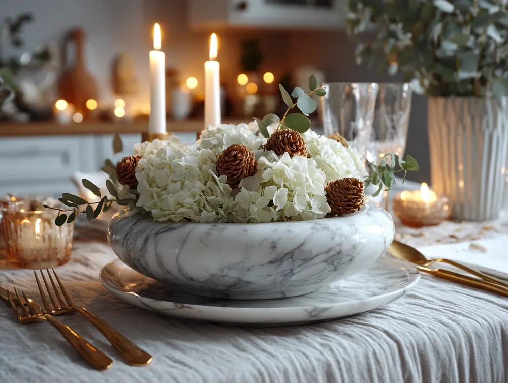 Transform your dining space into a festive haven with the understated luxury of marble. For a truly refined Christmas, pair your elegant marble dining table with a minimalist centerpiece. Think a shallow marble bowl filled with white hydrangeas and pinecones, accented by a few high-quality gold or silver taper candles. White linen napkins, subtle gold cutlery, and perhaps a single sprig of eucalyptus at each place setting complete the look. It’s about creating a welcoming, sophisticated atmosphere perfect for intimate holiday gatherings. 🕊️ Save this refined table setting inspiration! ⚪