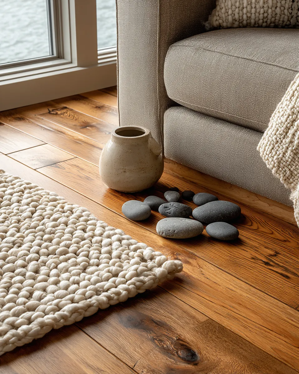 Imagine layering a soft, hand-knotted wool rug over simple wood flooring. Think about the tactile feel of linen upholstery on your sofa, contrasted with the smooth, cool surface of a stone-top side table.