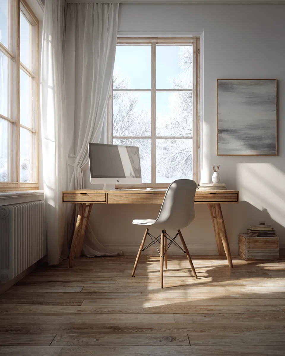 Design a home office that promotes focus and calm with Scandinavian minimalism. Clean lines, natural light, and intentional simplicity are key to productivity. 🌲
