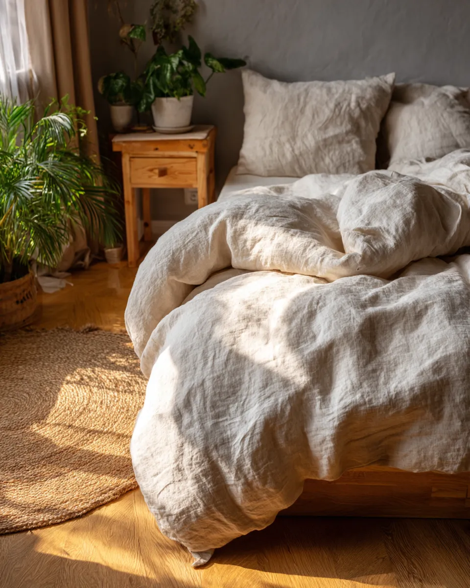 • Natural textures: Linen bedding, jute rugs, and wooden accents are key.