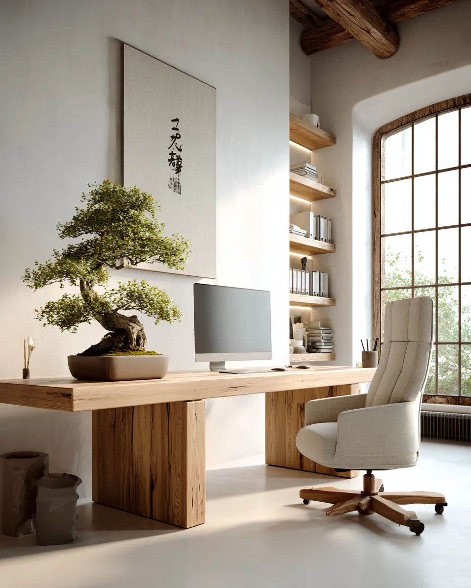 Design a home office that fosters focus and tranquility with Zen principles. Embrace minimalism, natural light, and a sense of calm. 🤍
