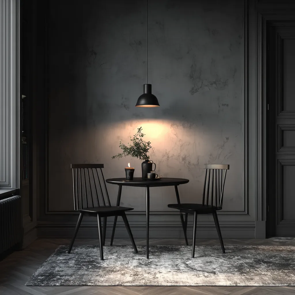 Create a stylish and intimate dining nook using a monochromatic palette. Perfect for smaller spaces or creating a cozy accent area. Think deep grey walls paired with black furniture, or a crisp white base with black accents and subtle grey textures.