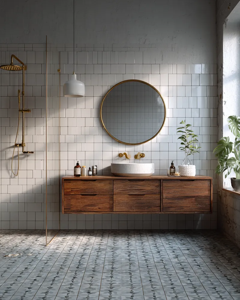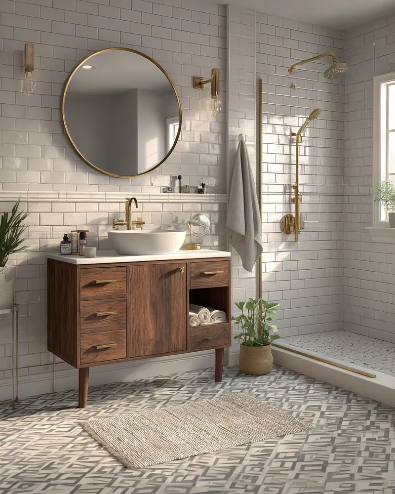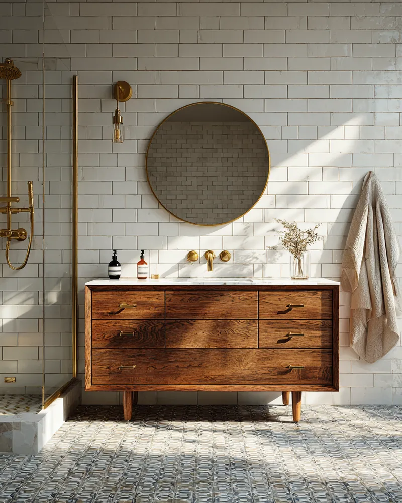 Bring that iconic Mid-Century Modern charm into your bathroom for a space that's both stylish and functional. Think clean lines and a touch of retro flair! 🌟 MCM bathroom ideas: * **Vanity:** A floating wood vanity or one with tapered legs. * **Tiles:** Hexagonal, subway, or penny tiles in classic colors or subtle patterns. * **Fixtures:** Brass or black fixtures for a sophisticated touch. * **Mirror:** A simple round or geometric mirror above the vanity. * **Color Palette:** Use muted pastels, earthy tones, or bold contrasts. Create your dream MCM bathroom retreat. Save this for renovation inspo! 💖