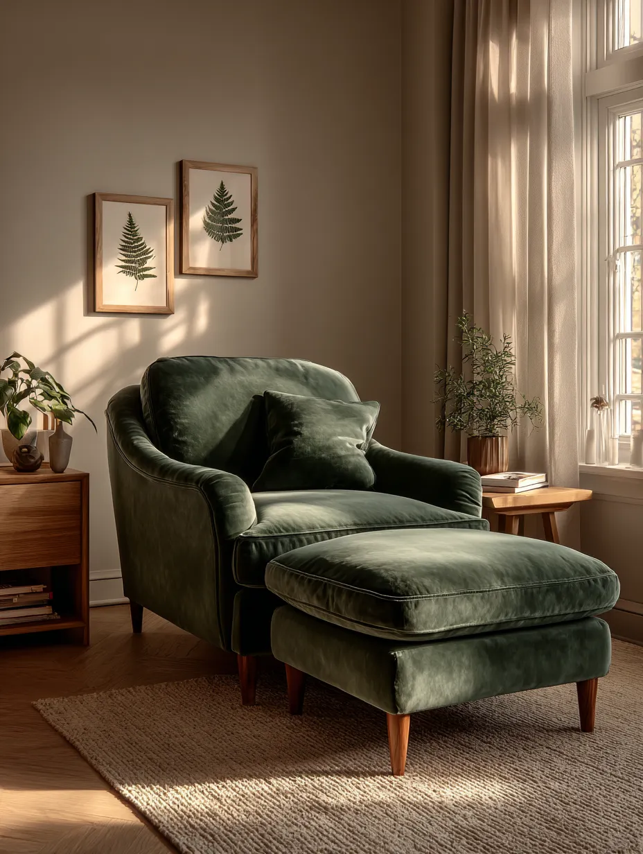 * Green Upholstery: A velvet armchair or linen cushions in muted forest tones.