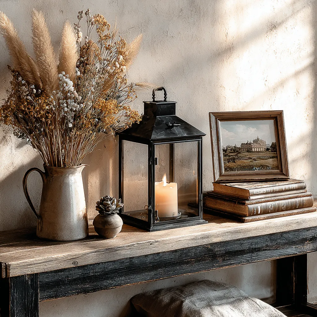 * **Anchor Piece:** Start with something substantial like a lantern, a pitcher, or a rustic sign.