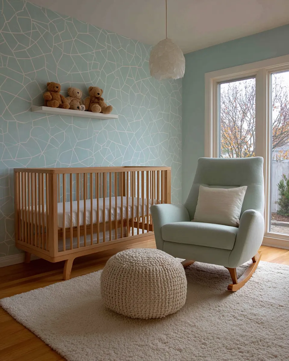 🪵 Natural Wood Accents: Wooden cribs, rocking chairs, and toy storage add warmth and a vintage feel.