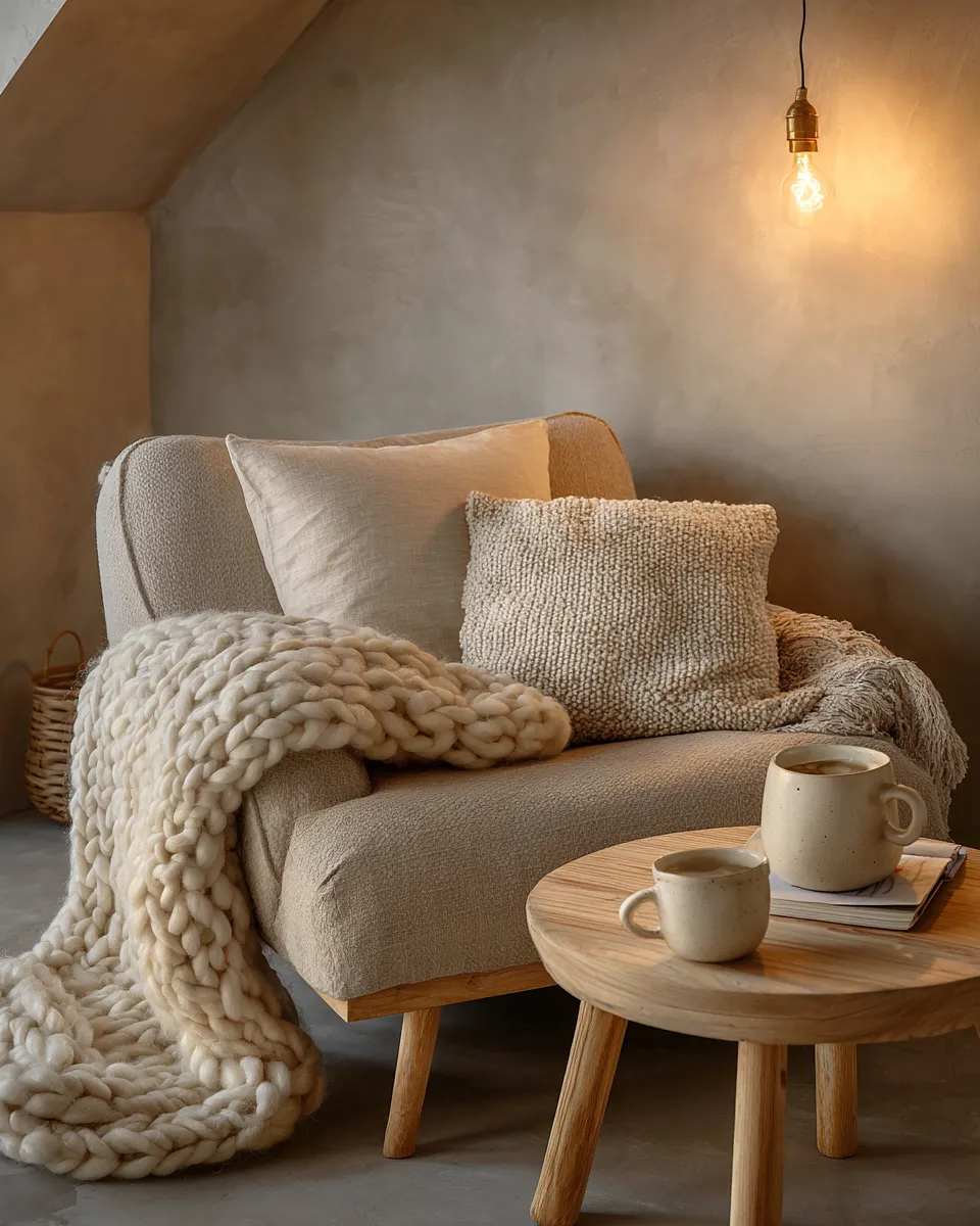 * **Soft Textiles:** Layer a chunky knit throw and soft linen pillows.