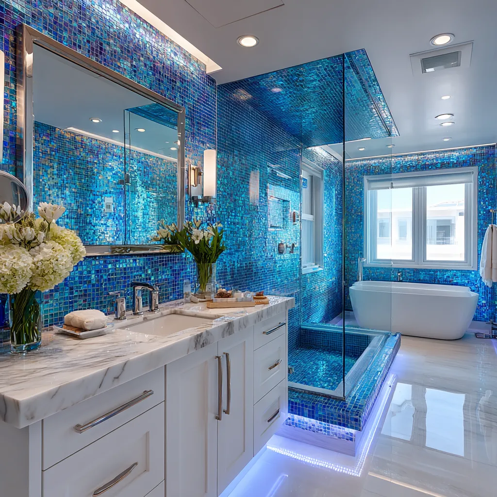 Bring the tranquil beauty of the cosmos into your bathroom for a spa-like escape! ๐ At [Celestial Designs], we focus on creating atmospheres that soothe and inspire. Think deep, jewel-toned tiles โ perhaps sapphire blue or amethyst โ paired with polished chrome or brushed nickel fixtures. A vanity with a marble top and clean lines adds a touch of sophistication. Consider lighting that mimics soft moonlight for a truly celestial feel.