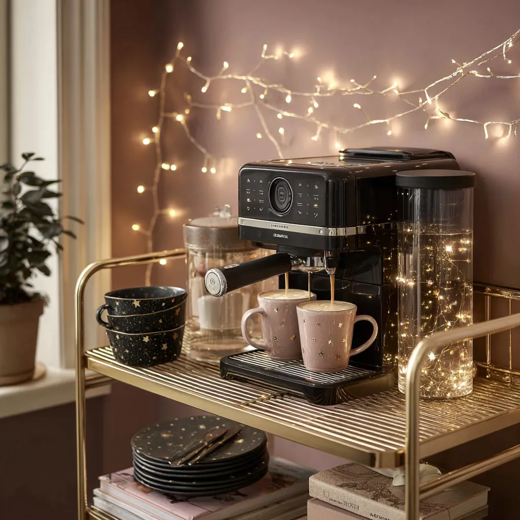 Elevate your daily coffee ritual with a touch of celestial magic! 🌟 [Celestial Designs] loves infusing everyday spaces with otherworldly beauty. Imagine a small, cozy corner featuring a sleek bar cart with dark wood or metallic accents. Add a few ethereal ceramic mugs in deep blues or starry patterns. A small, decorative lantern or fairy lights can cast a gentle, enchanting glow, turning your coffee break into a moment of cosmic reflection.