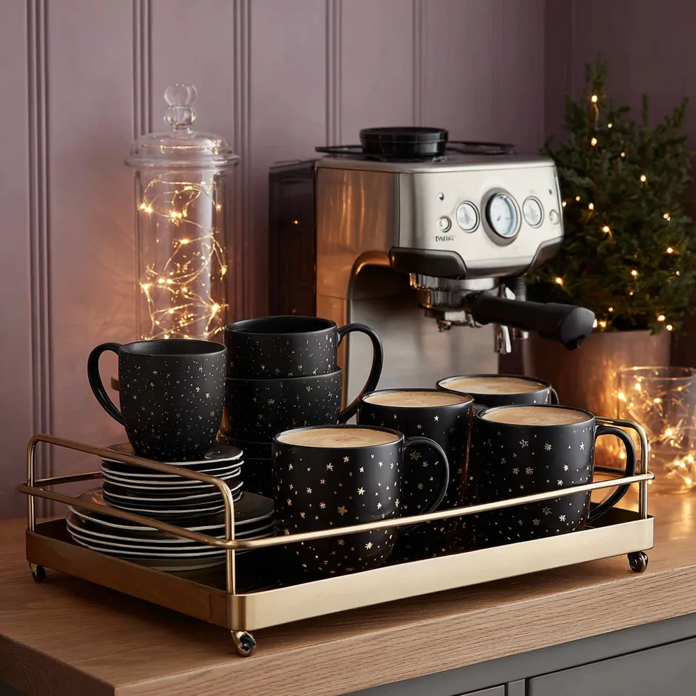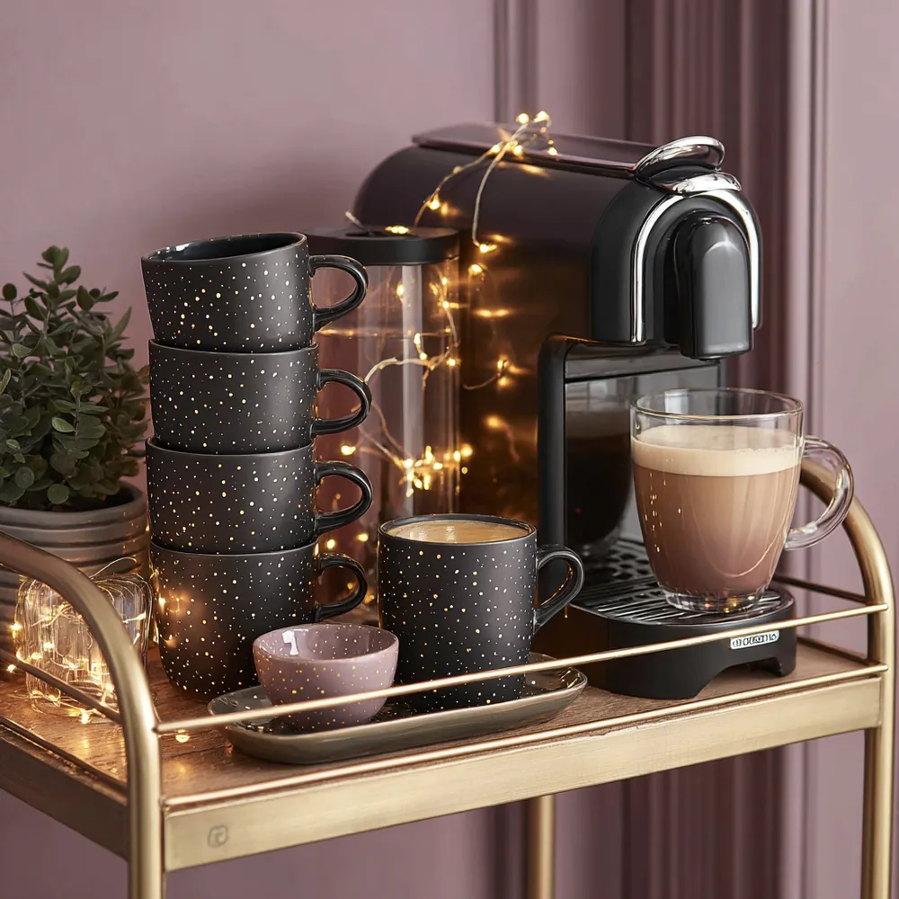 Elevate your daily coffee ritual with a touch of celestial magic! 🌟 [Celestial Designs] loves infusing everyday spaces with otherworldly beauty. Imagine a small, cozy corner featuring a sleek bar cart with dark wood or metallic accents. Add a few ethereal ceramic mugs in deep blues or starry patterns. A small, decorative lantern or fairy lights can cast a gentle, enchanting glow, turning your coffee break into a moment of cosmic reflection. ✨ Keep it compact and inviting. 🌟 Think about textures like matte ceramics. 💫 Ambiance is key for a relaxing break.