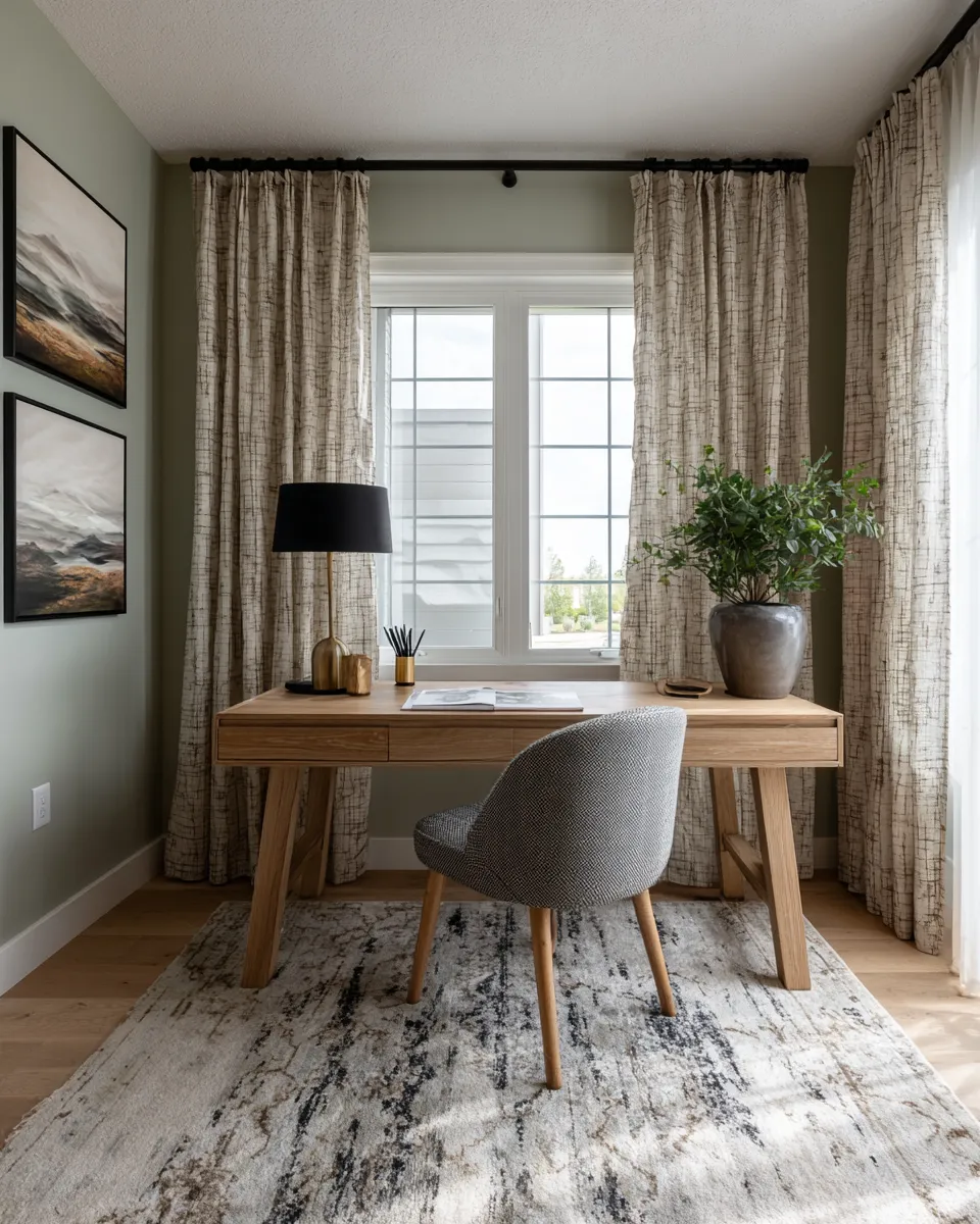 Pair sage green walls with light wood furniture and simple, functional decor. Think minimalist desk accessories, a comfortable ergonomic chair, and perhaps a touch of metallic accent like brushed brass for warmth.