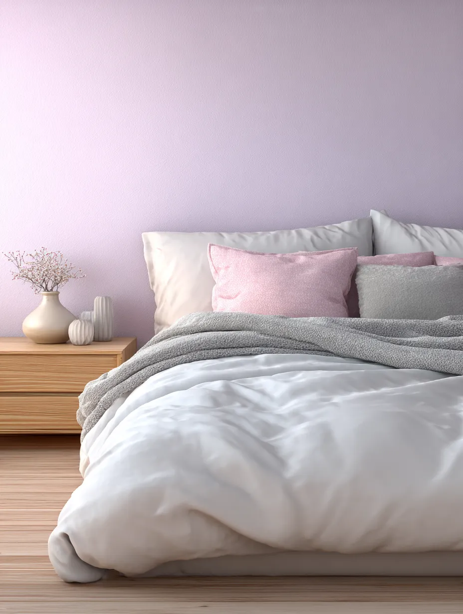 I love pairing lavender walls with crisp white bedding and accents of soft grey or natural wood. Add touches of metallic like rose gold or silver for a delicate shimmer.