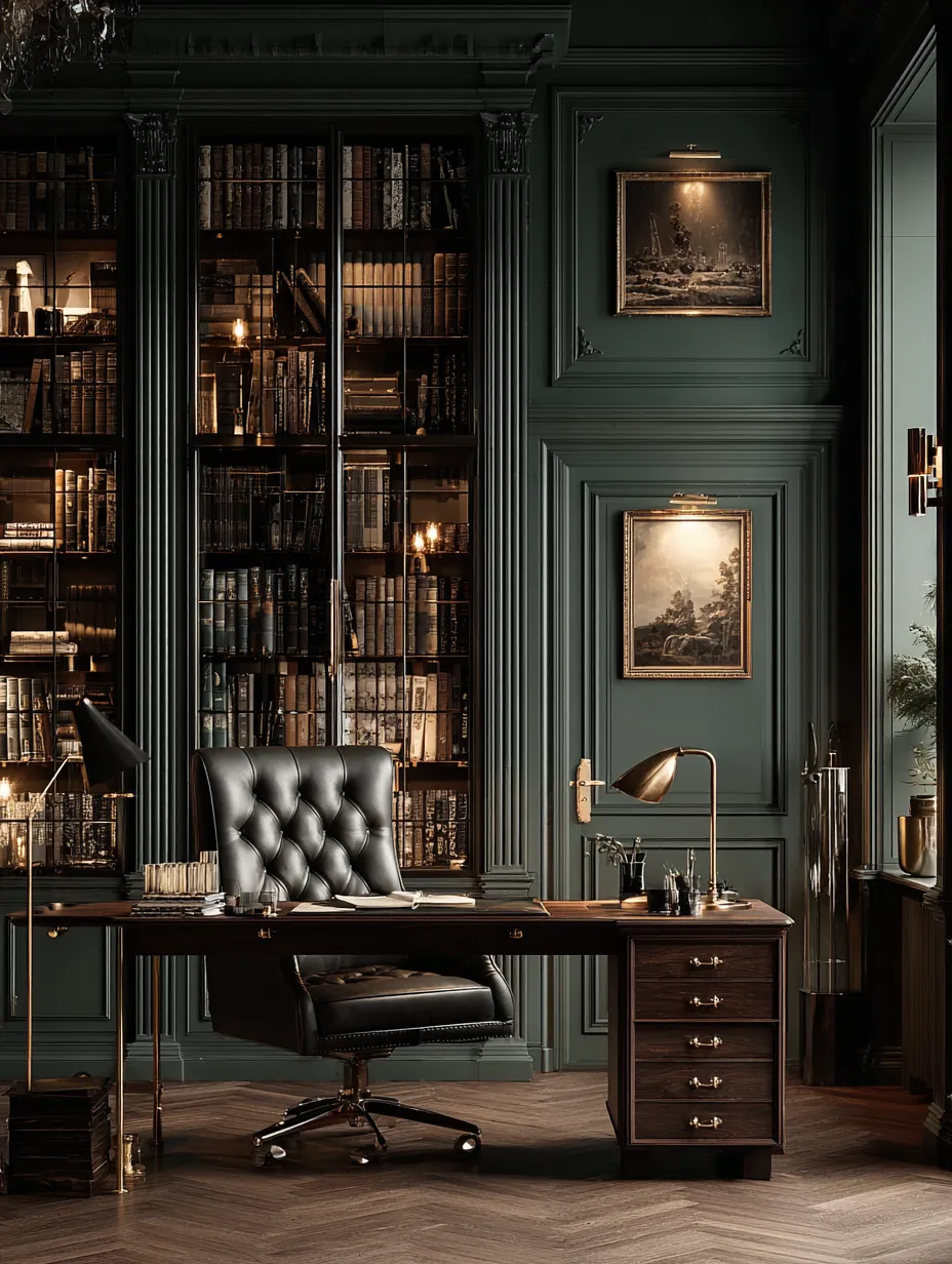 I love pairing deep forest green walls with warm wood tones like walnut or mahogany, and accents of brushed brass or matte black. Leather details add a touch of timeless luxury.