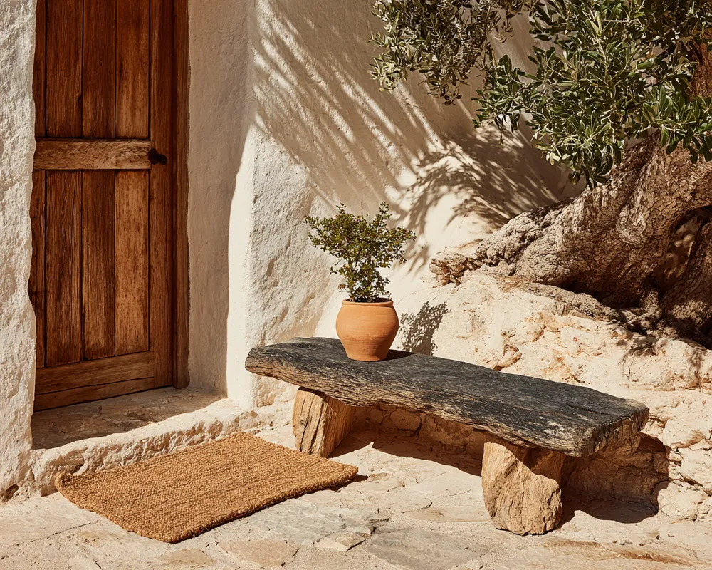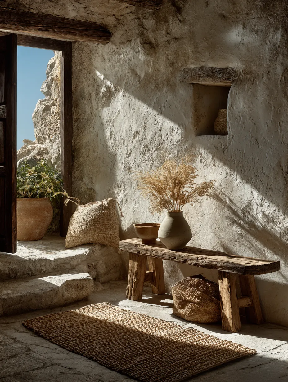 I love using soft terracotta tones on walls or for accent pieces, balanced with creamy white and natural, imperfect textures like raw wood, aged plaster, or linen. Minimalist decor is key to enhancing the serene feel.