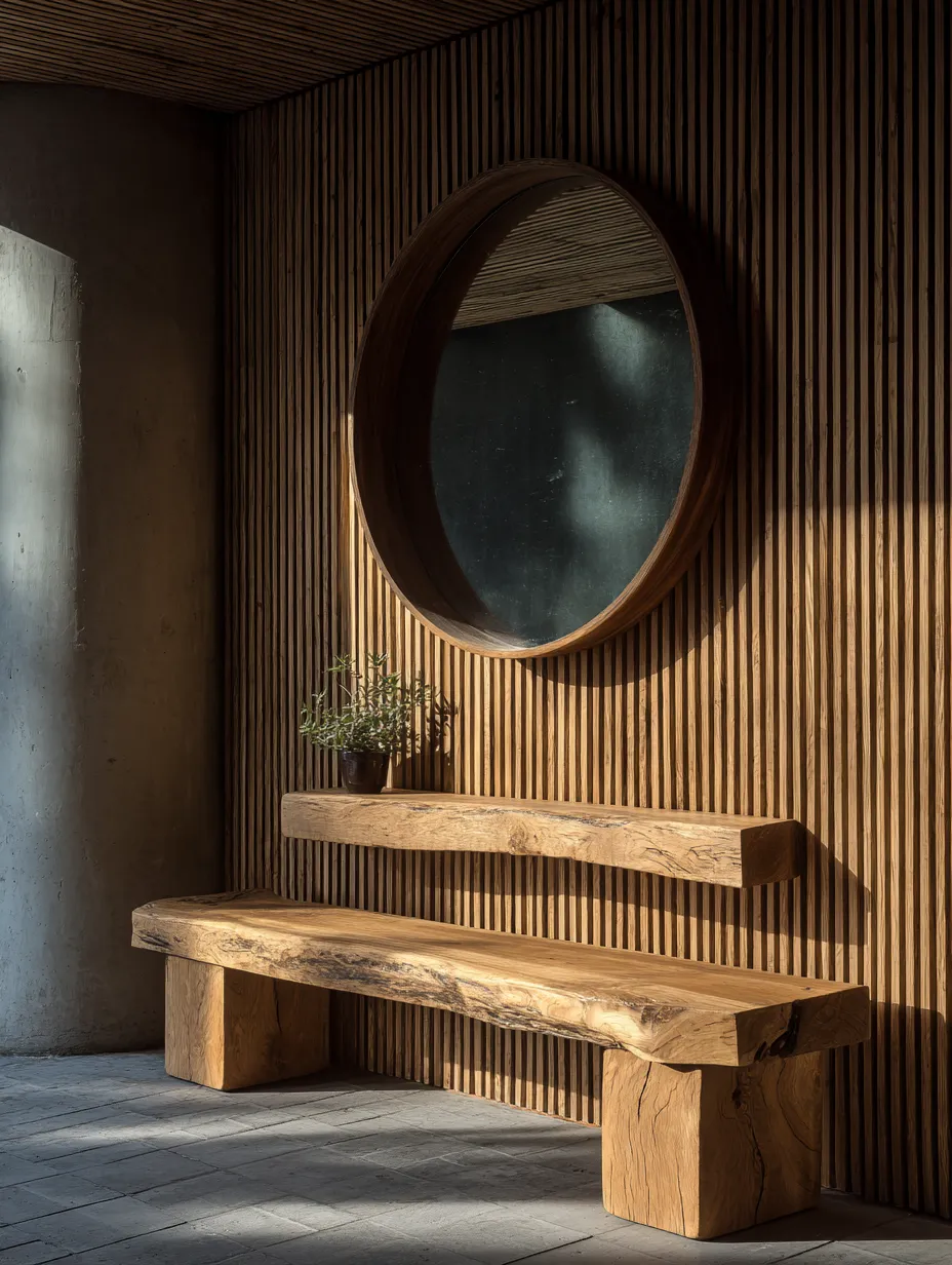 Embrace the beauty of wood for a welcoming, sophisticated entrance. Save this for your future home inspo! #EntrywayIdeas#NaturalWoodDecor#WoodFurnitureIdeas#HomeEntrywayIdeas#InteriorWoodDetailsIdeas#WoodDesign#HomeDecor#EntrywayInspo#SustainableLiving#NaturalMaterials