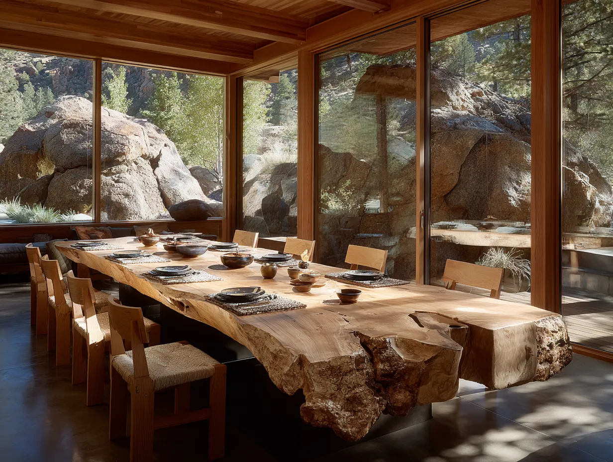 Dine in harmony with nature at your own wooden table. Save this for your natural dining inspo! #WoodDiningTableIdeas#BiophilicDiningIdeas#NaturalTableIdeas#NatureConnectedHomeIdeas#DiningRoomWoodIdeas#DiningTableDesign#WoodFurniture#Biophilia#HomeDecor#DiningInspiration