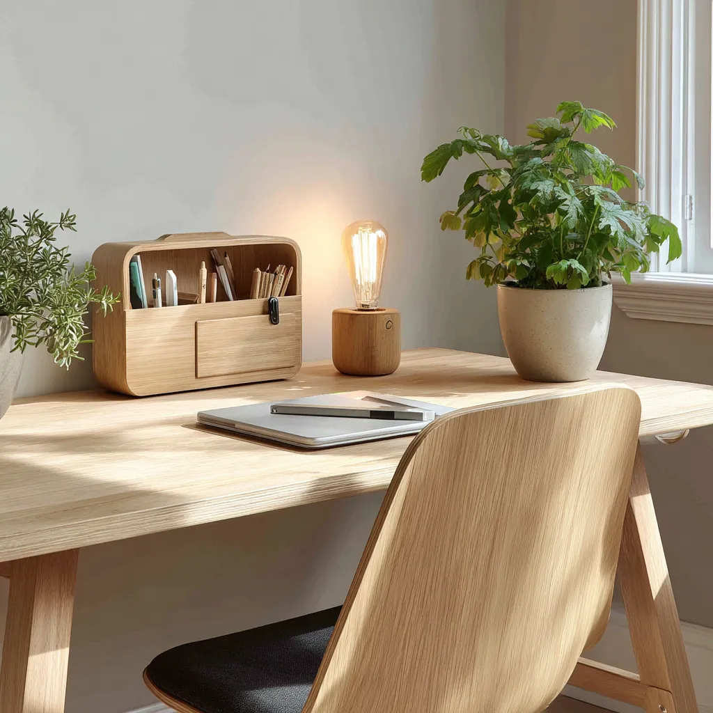 Choose a simple, functional desk made of light-toned wood. Pair it with an ergonomic yet minimalist chair. Keep surfaces clutter-free; use a desk organizer made of wood or bamboo. Natural light is essential, so position your desk to maximize it. Consider a small potted plant to add a touch of life and calm.