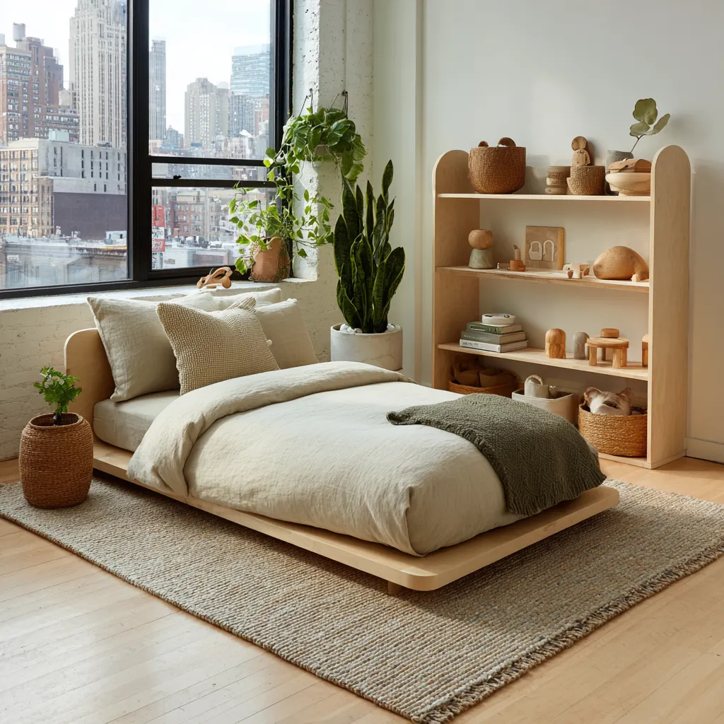 Opt for natural materials like light wood for furniture and storage. Keep color palettes soft and muted, with pops of natural color from toys or textiles. Prioritize minimalist, functional storage solutions to keep play areas tidy and calm. Montessori-inspired furniture fits seamlessly.