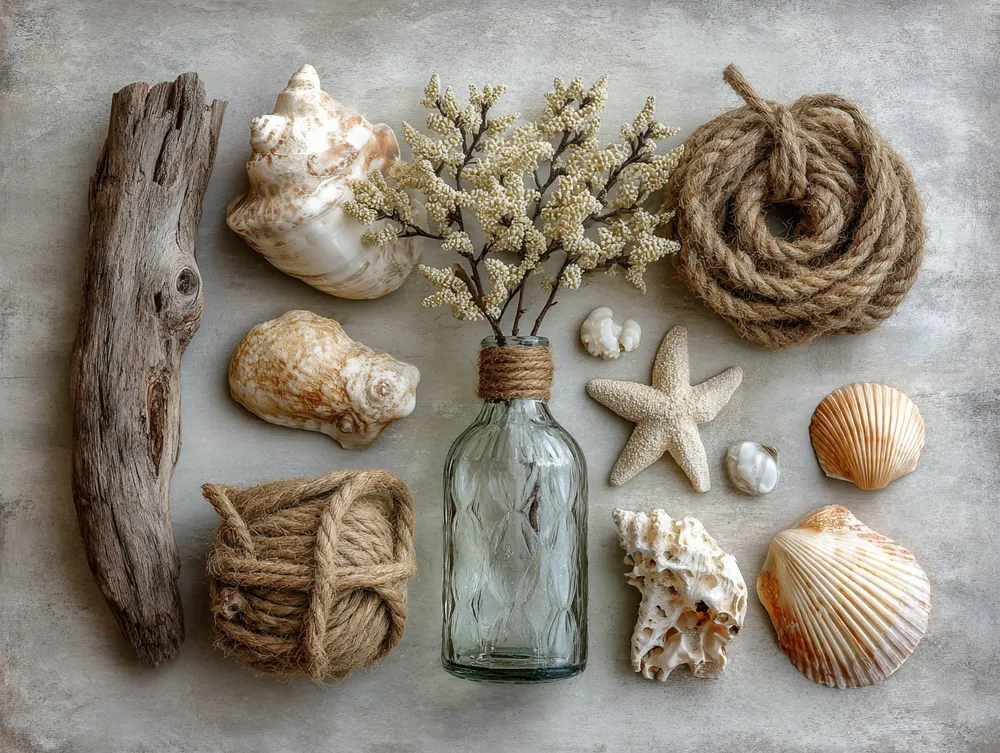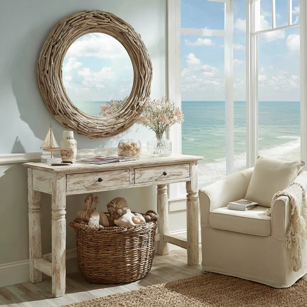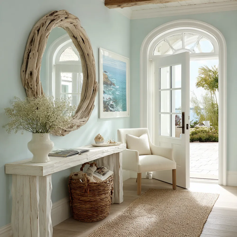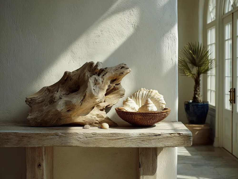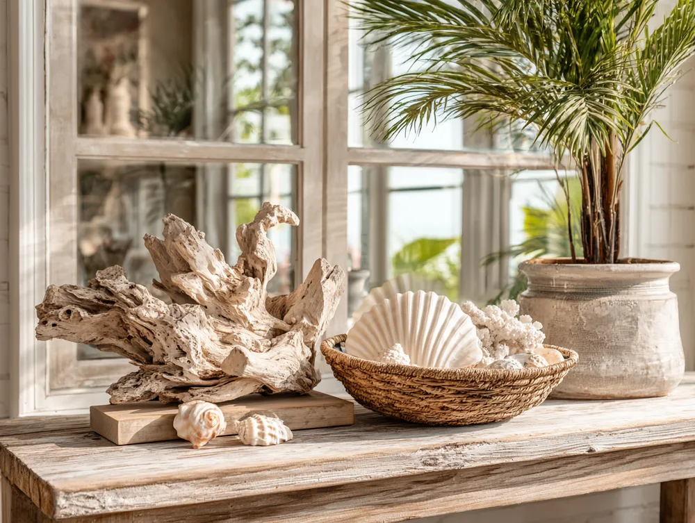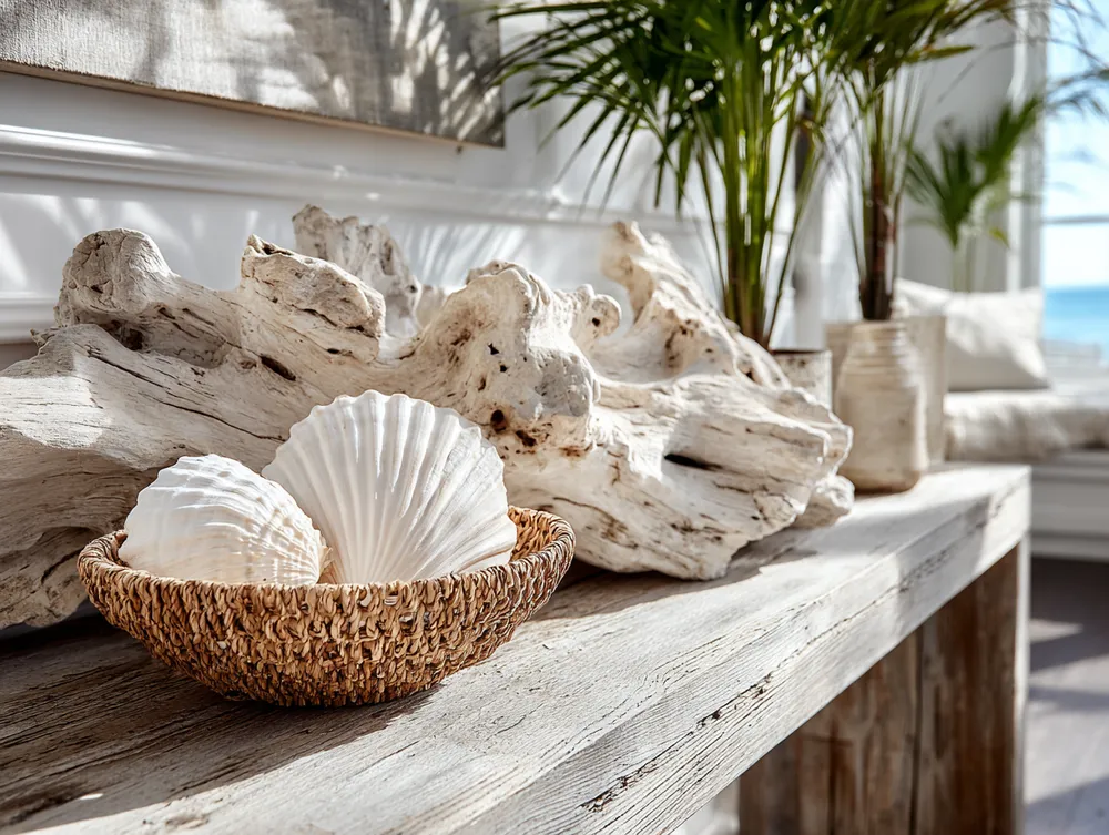 Large potted palms, seagrass plants, or even simple eucalyptus branches in a vase can evoke the beach. Choose planters that complement your coastal decor – natural materials like terracotta, woven baskets, or simple white ceramic pots.